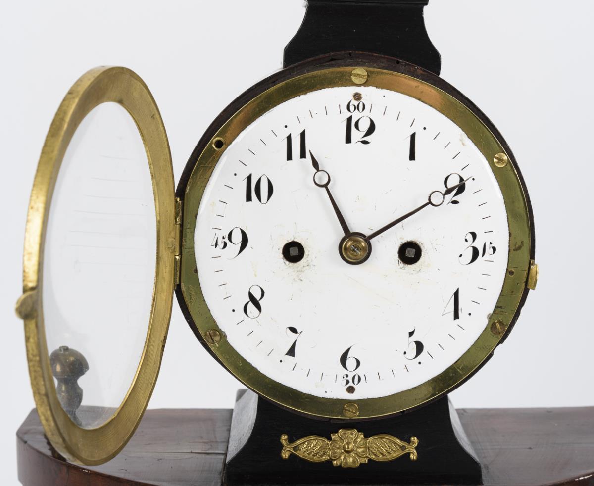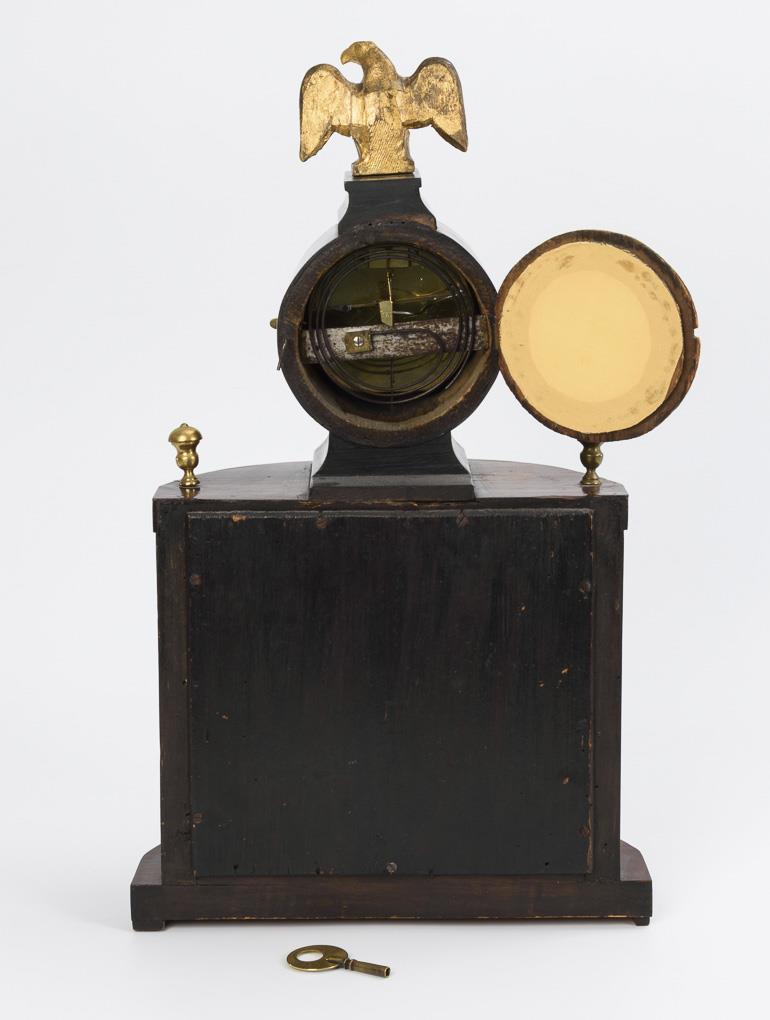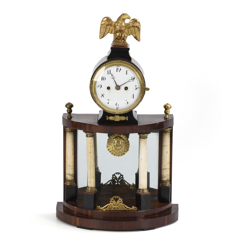 Semicircular case with large clock drum on column portal with mirrored back. Decent brass decoration and crowning eagle sculpture. Signs of use and age, additions and slight defects.