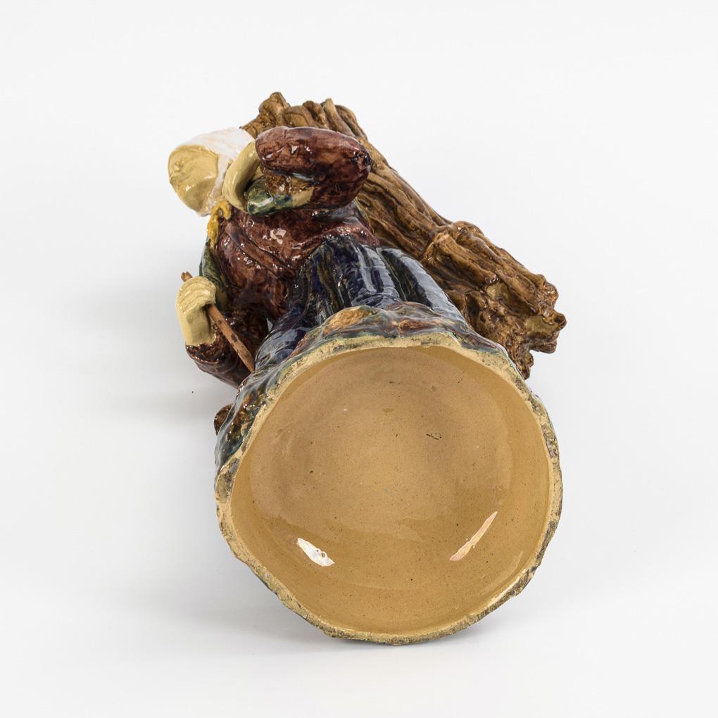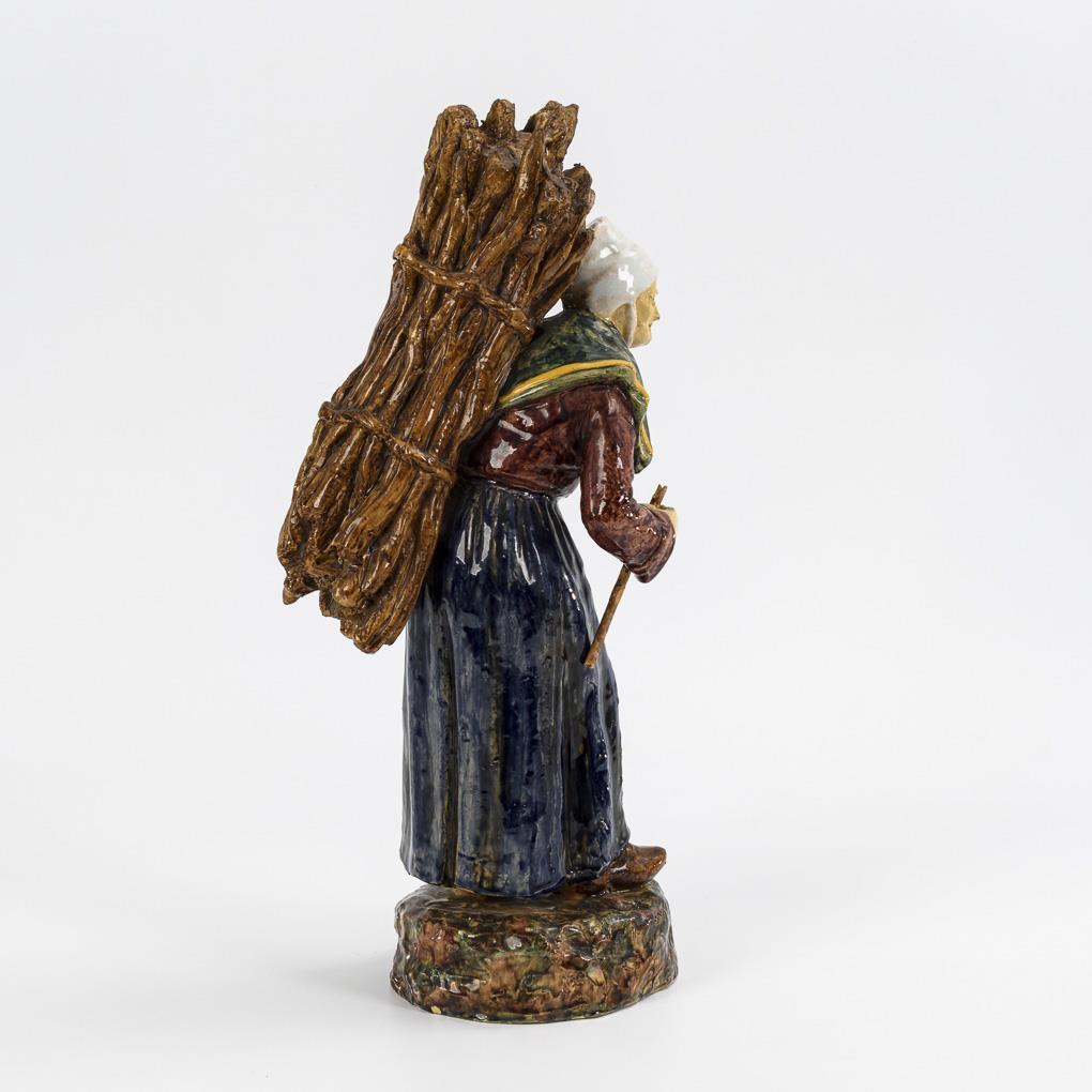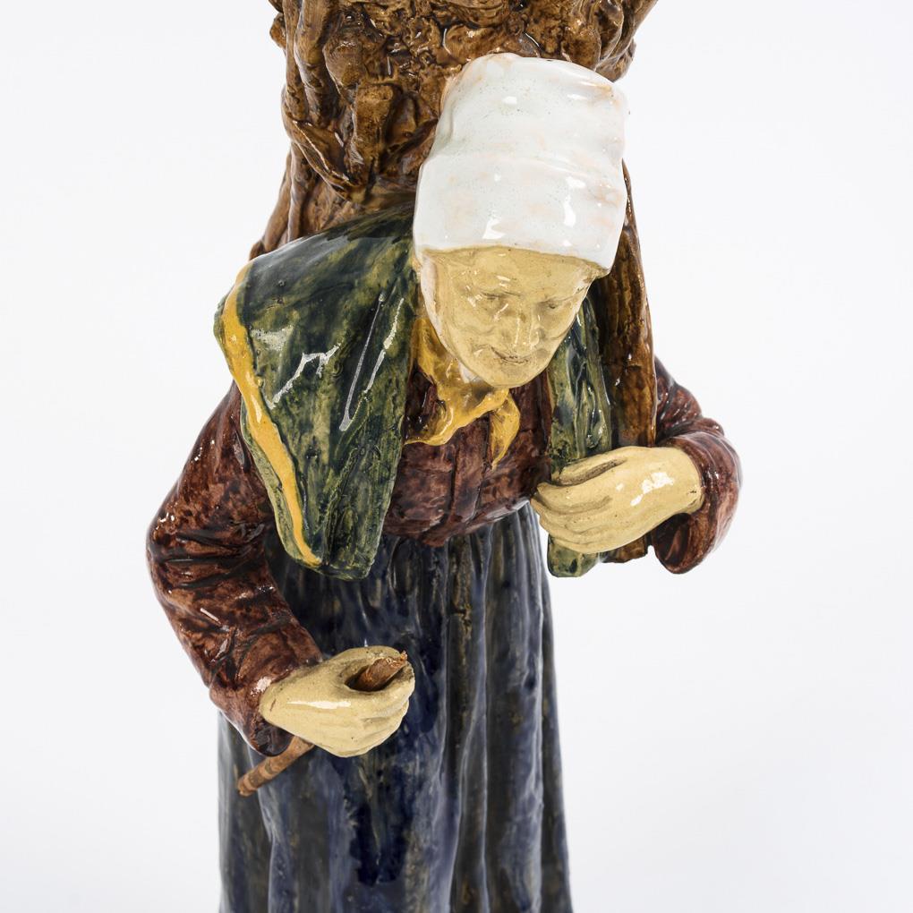 Old peasant woman with wooden shoes and shouldered wooden bundle. Added wooden stick defective, partially slightly fire cracked and glaze chips.