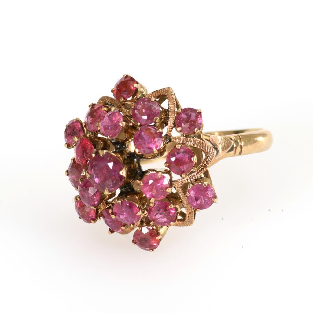 Blütenringkopf mit erhöht chatongefassten Rubinen. Schmale Schiene. 1 kleiner Stein ergänzt.