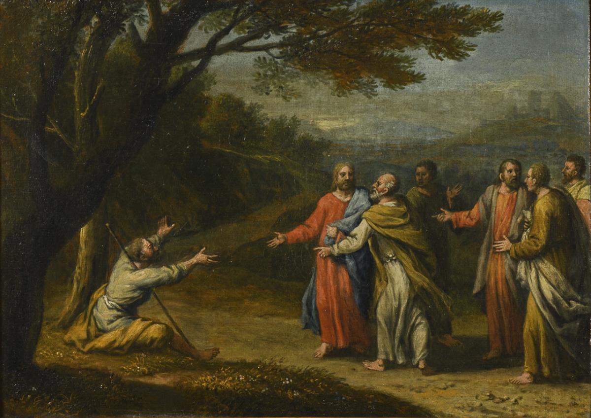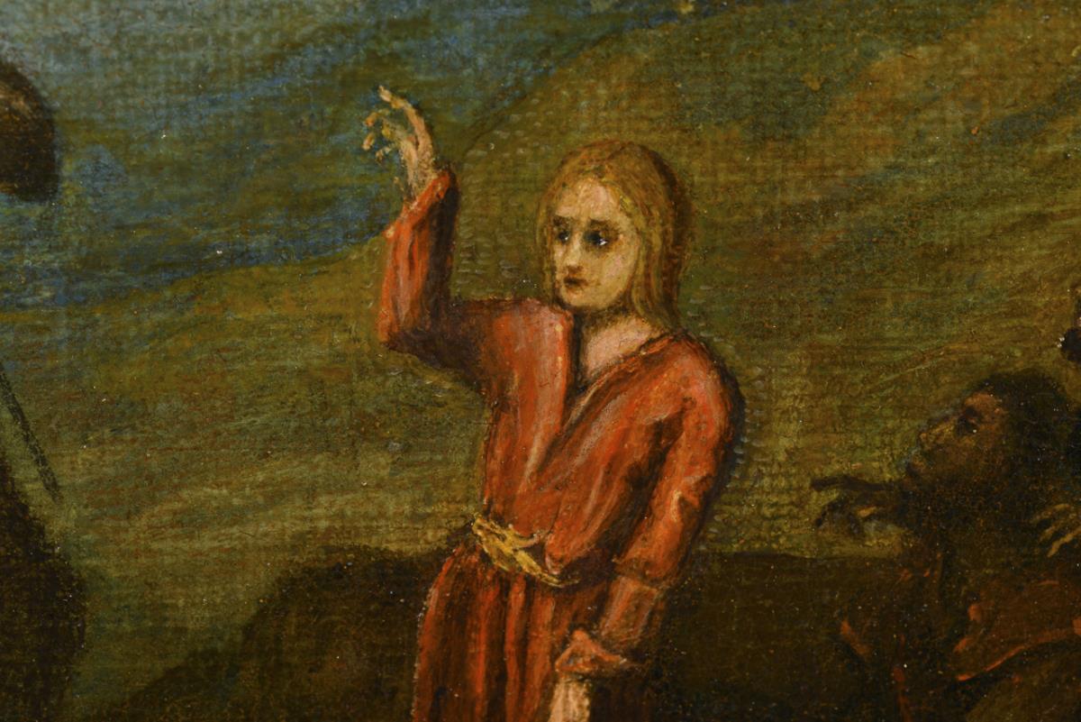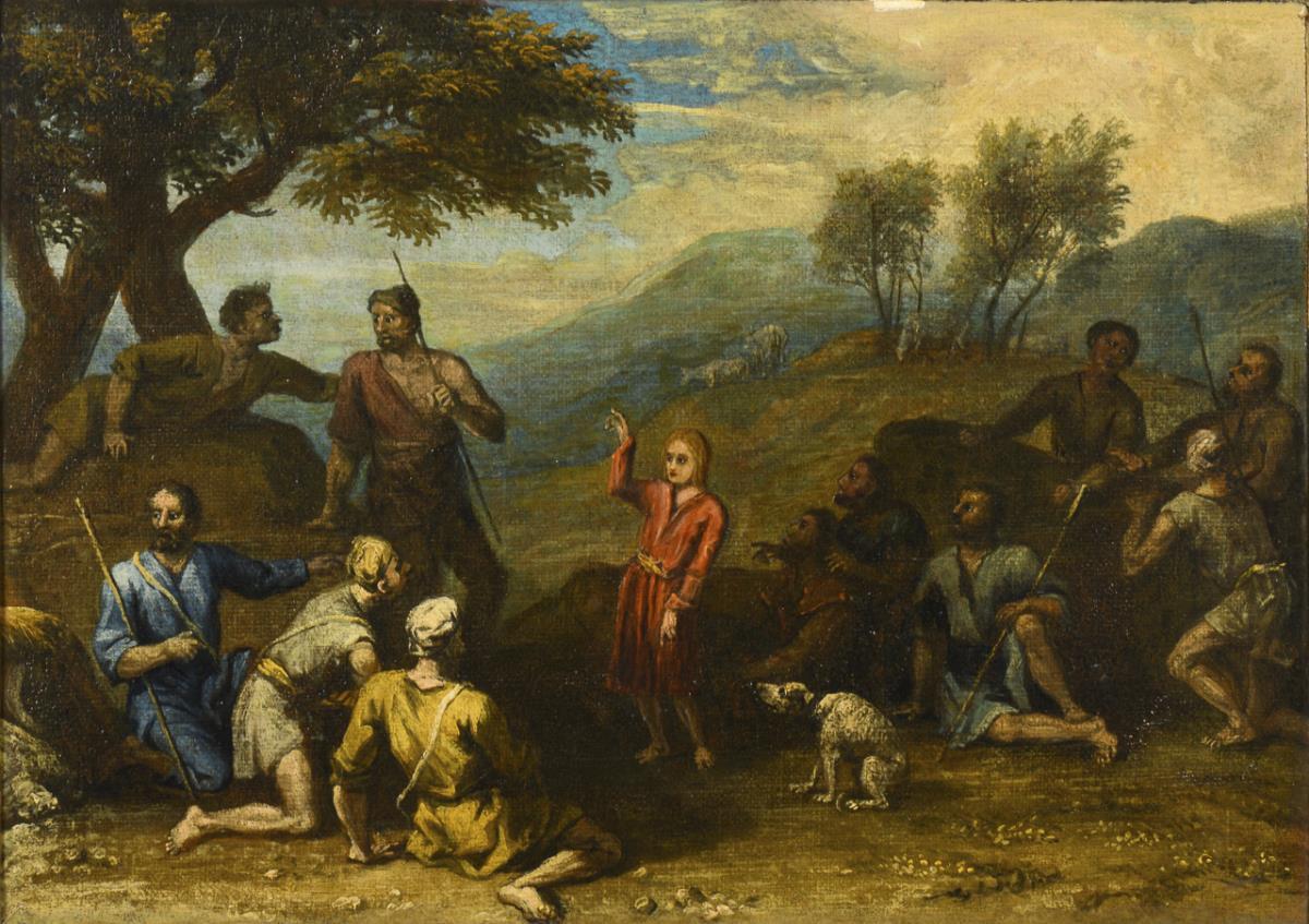 Depiction of the healing of the lame man on the roadside, as well as a scene with shepherds listening intently to a boy. Each canvas doubled.