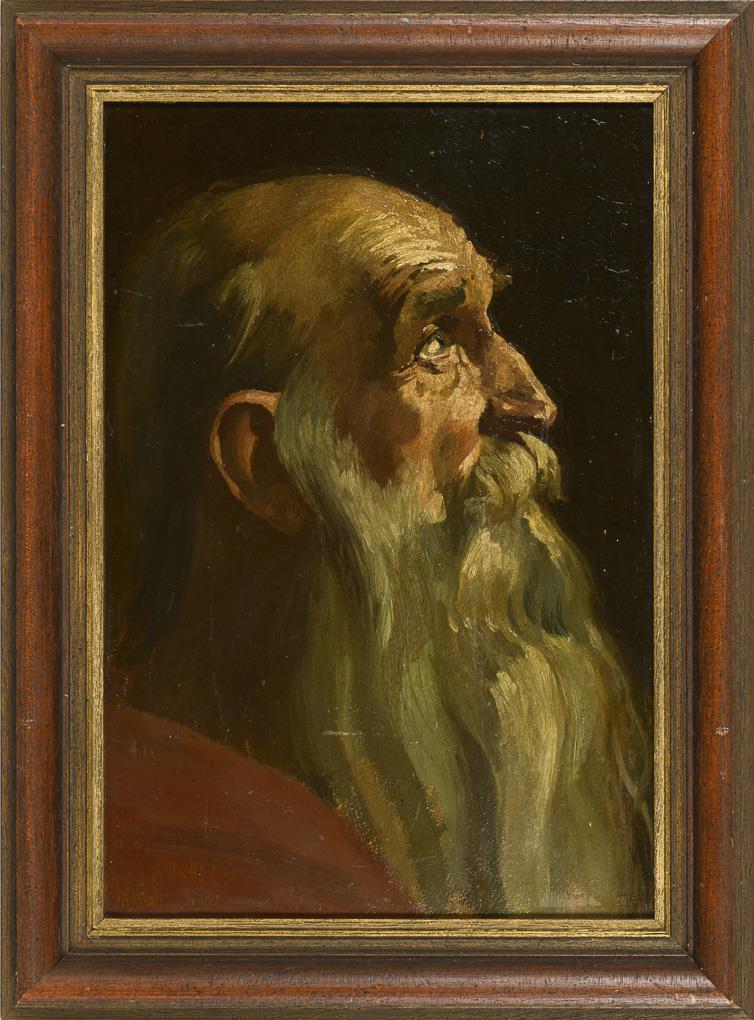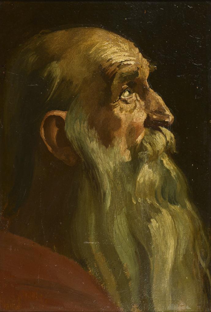 Portrait of an old man with long beard and upturned gaze in profile.