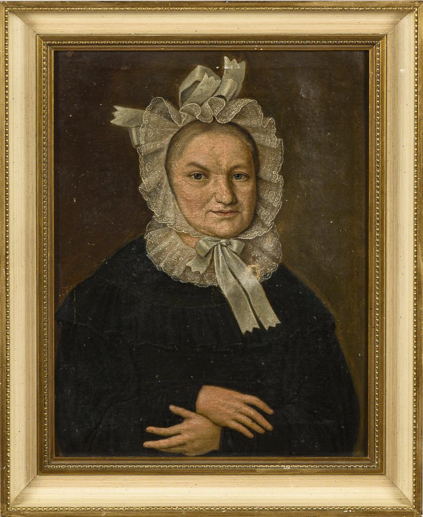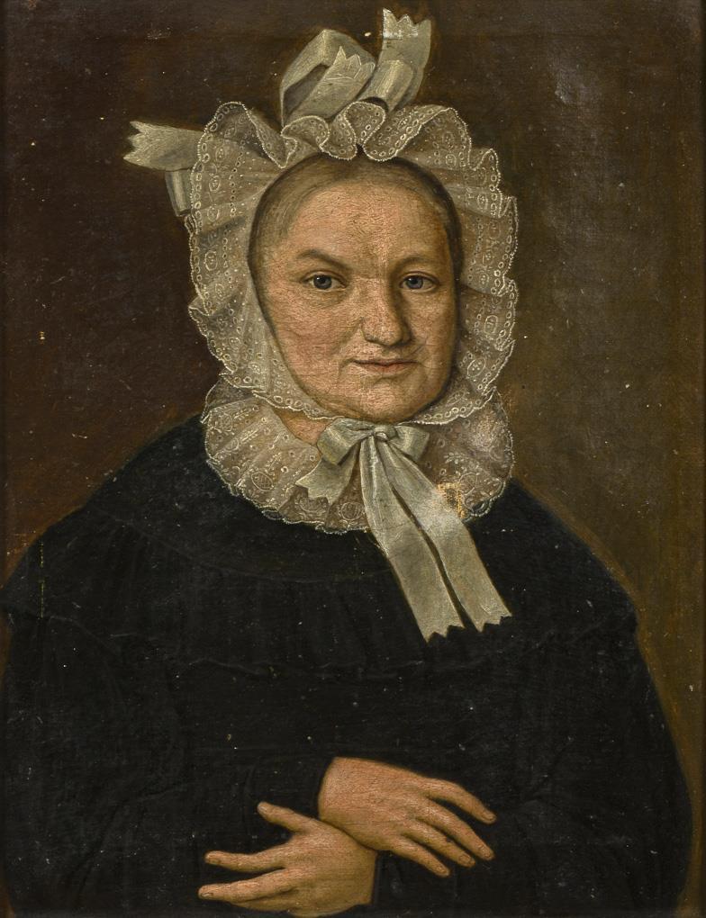 Portrait of an elderly woman in black dress with lace bonnet. A glued spot.
