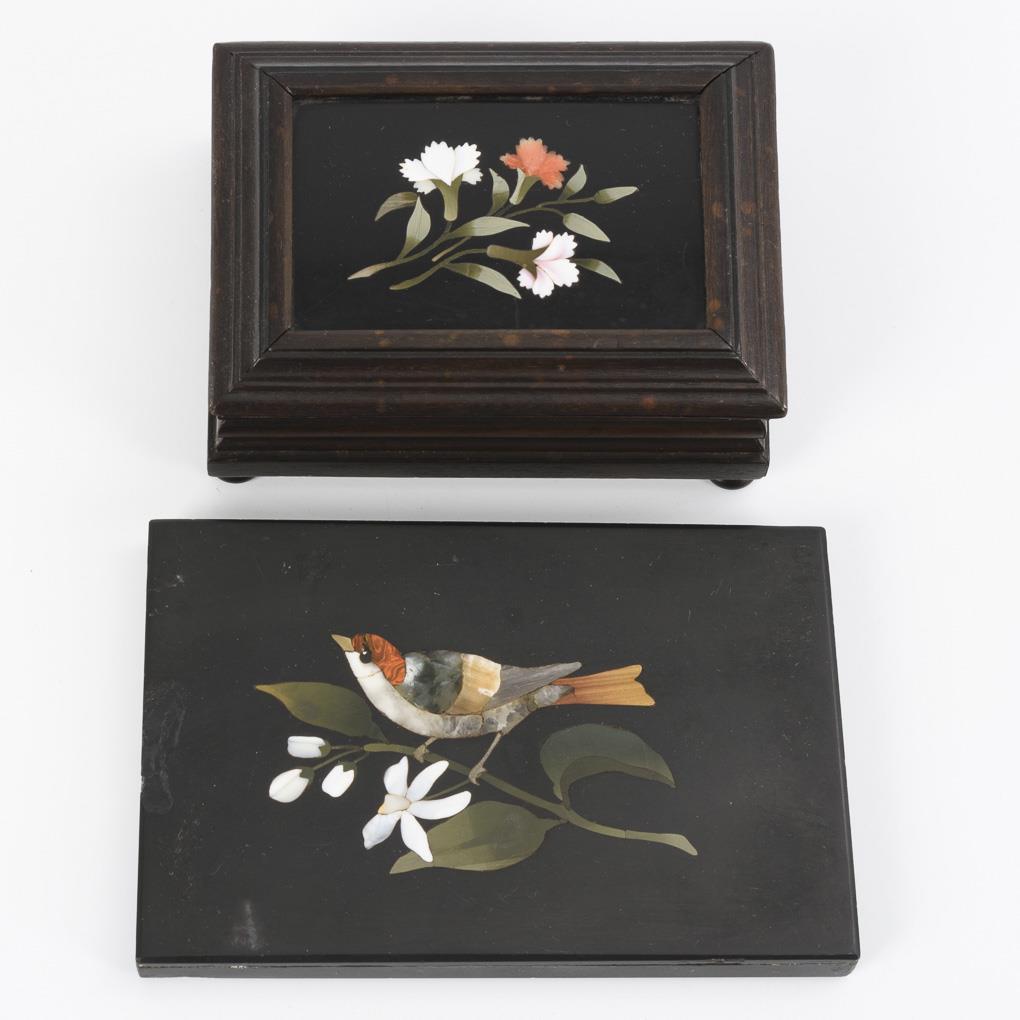 1 casket with Fiori di Pietre mosaic and 1 Pietra Dura mosaic plate.