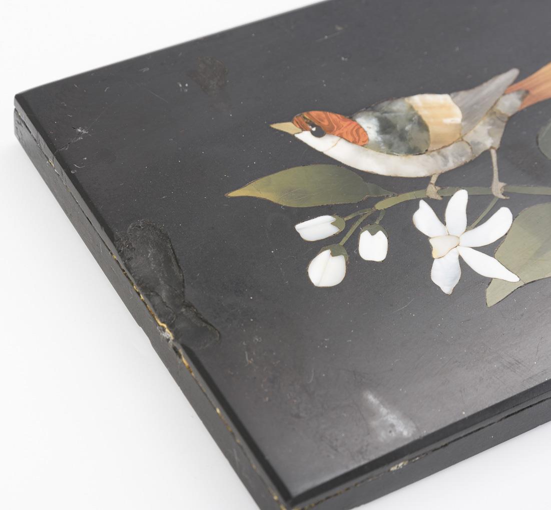 Profiled casket with floral stone mosaic on hinged lid. Mosaic plate with bird on flower branch. Chipping and hairline cracks on the edge of the unframed base plate.