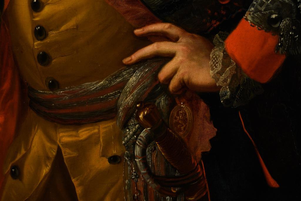 Porträt des Adligen mit Hosenbandorden, Großem Stern des Schwarzen Adlerordens und wohl auf dem roten Gehrock den Großen Stern des Haus- und Verdienstordens Oldenburg vor einer Landschaft. Leinwand doubliert.