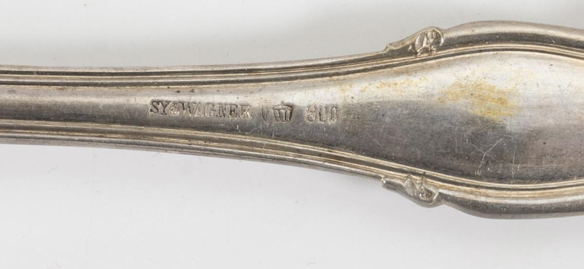 Crescent/crown/800 and jeweler's mark SY & Wagner hallmarked, mostly Koch & Bergfeld company mark. Mother of pearl cutlery with silver plated blades and prongs.