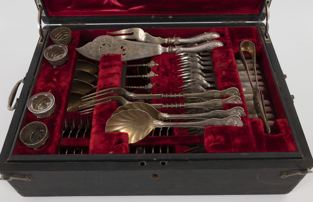 87 pieces: 18 fish knives, 18 fish forks and 16 fruit knives with mother-of-pearl handles, 18 dessert spoons. Various serving pieces: Fish knives and fish fork with dolphin handles, 4 spoons with twisted handle and female heads, 1 floral engraved tongs, 2 ladles, 2 meat forks and 2 spoons with shell reliefs, 4 basket-shaped salvers (2x of them with glass insert). Predominantly with ligatured monogram WR(?), partly gilt. Signs of age and use, partly rubbed, 2 glass inserts missing.