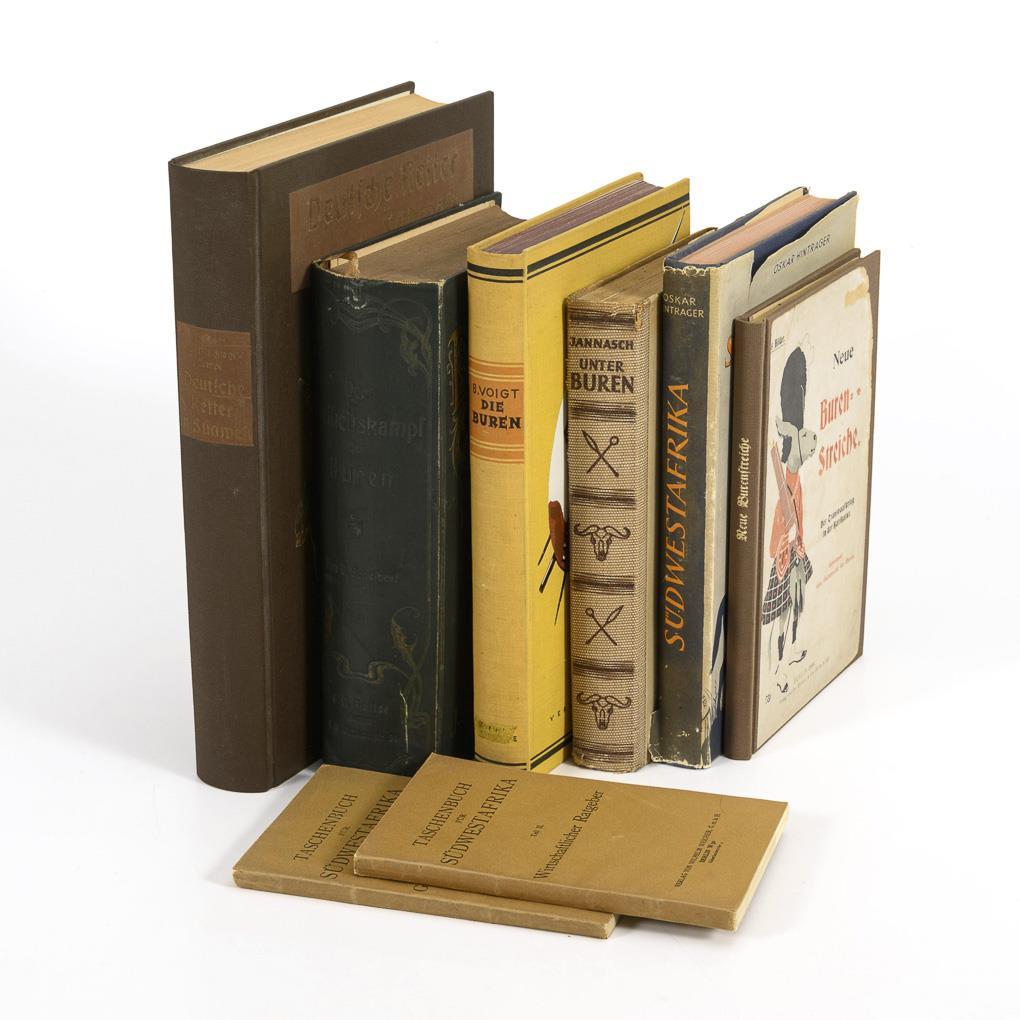 von Dicklagen-Campe: "German Riders in Southwest", 480 pp. / Scheibert: "The freedom struggle of the Boers", 3 parts in one volume. 272, 400, 472 pages and 2 maps. / Voigt: "The Boers - South African frontier book", 253 pages. / Jannasch: "Among Boers, British, Bantus", 248 pages and map. / Hintrager: "South West Africa in the German period", 261 pp. / "New Boer Pranks - The Transvaal War in Caricature", Berlin 1900, 86 pages, rebound. / 2x "Pocketbook for Southwest Africa" (laws and regulations; economic guide), softcover 212 and 131 pages.