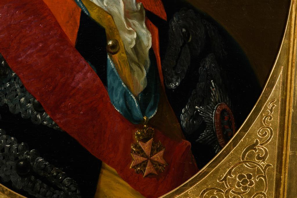 Bildnis des Adligen mit dem von ihm gestifteten Verdienstorden Pour la vertue militaire und wohl dem Großen Stern des Haus- und Verdienstordens Oldenburg. Leinwand doubliert.