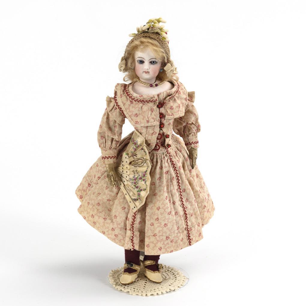 Crank head on breastplate, fixed blue glass eyes, earrings, blond mohair wig. White leather body with sewn hands. Pink flowered old dress, straw barge hat, burgundy stockings and shoes, plus fan. Tiny chip on the left eye.