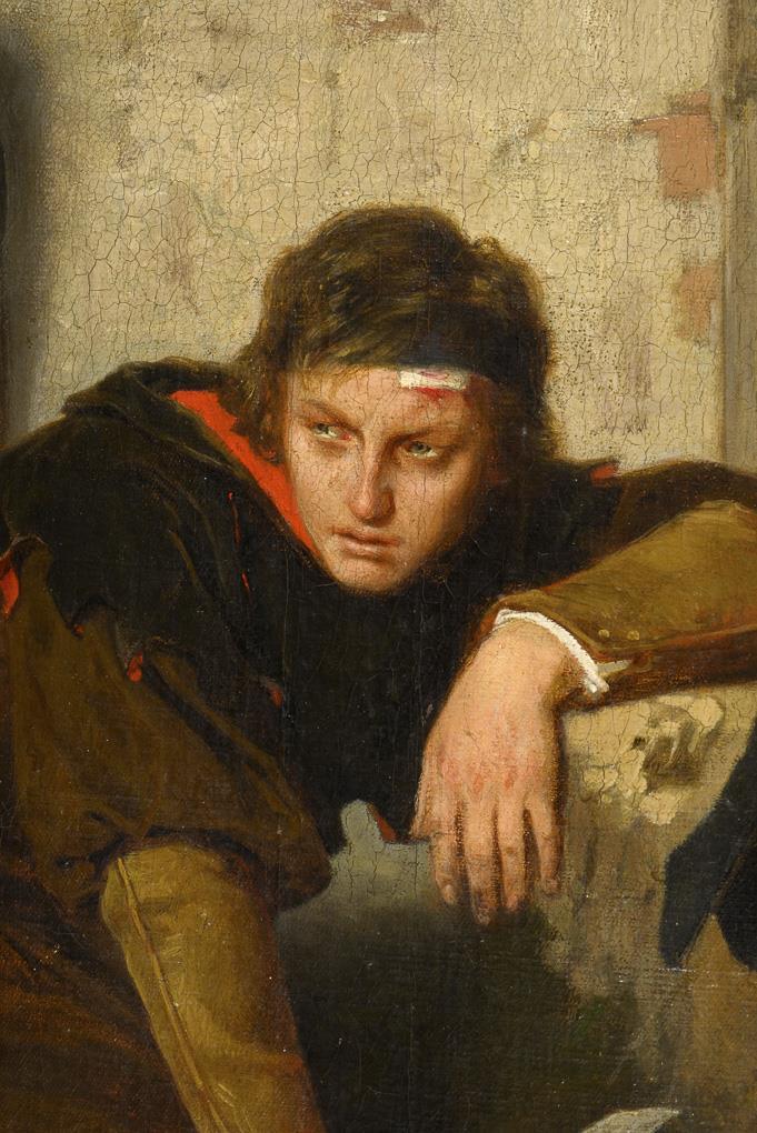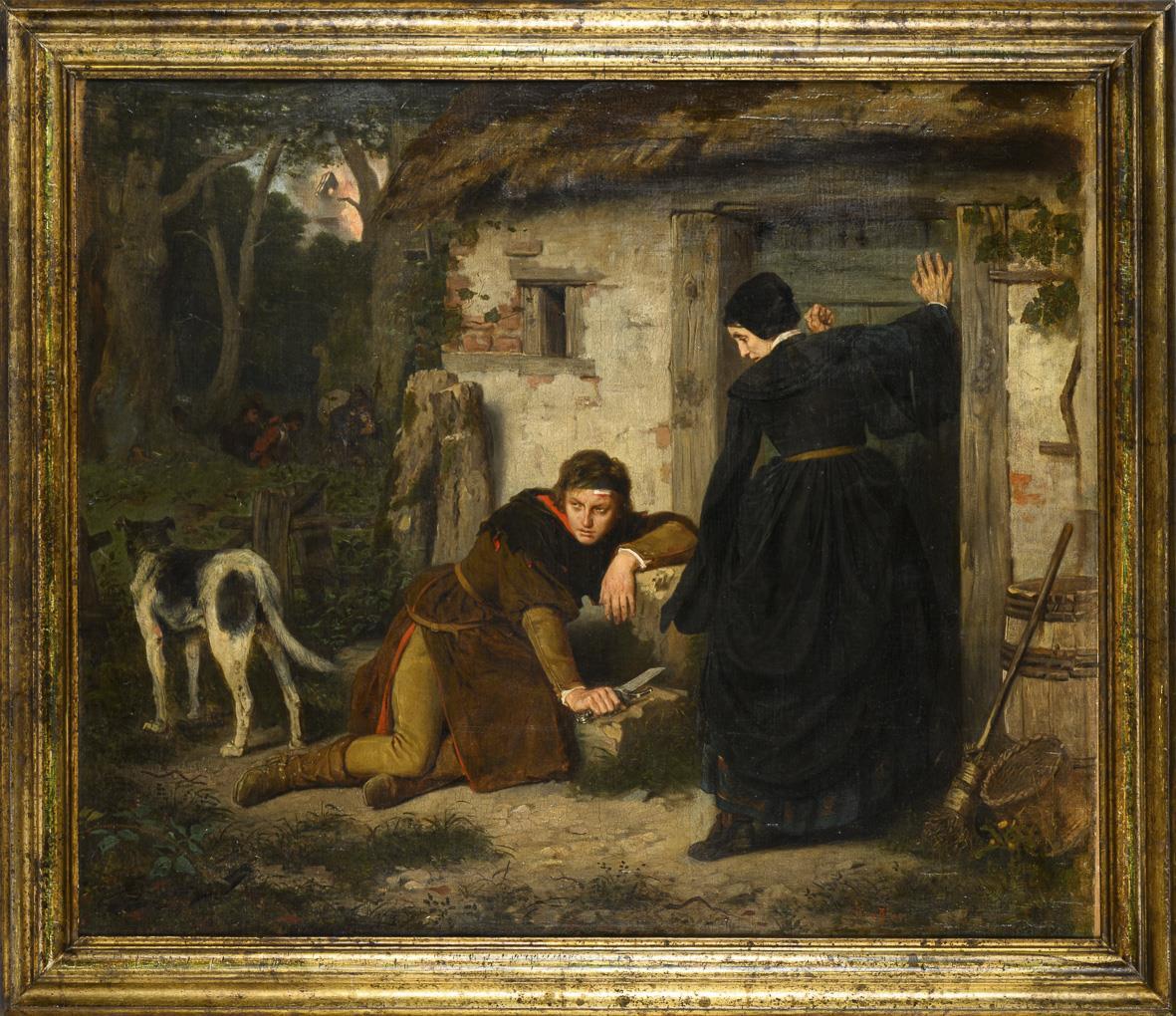 Injured and with broken blade in front of a farmhouse crouching man with glazed look, while a woman in black dress panic knocks on the door. Traces of age.