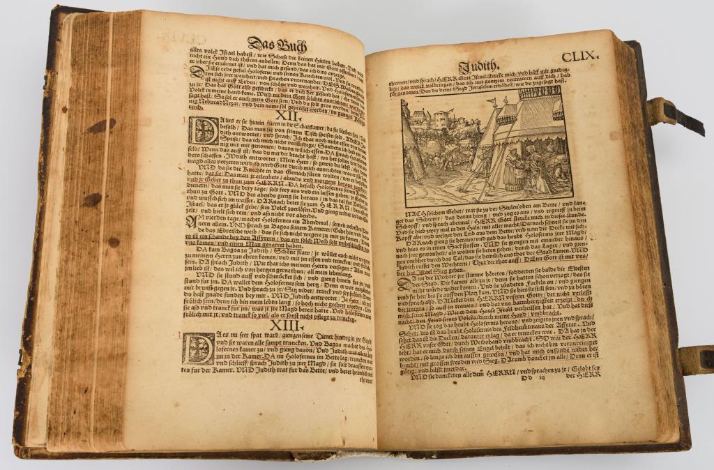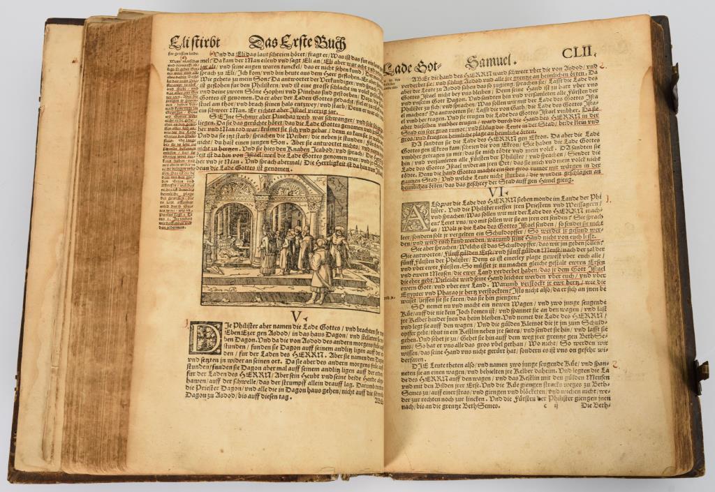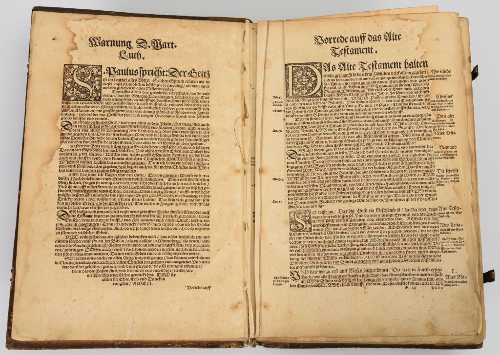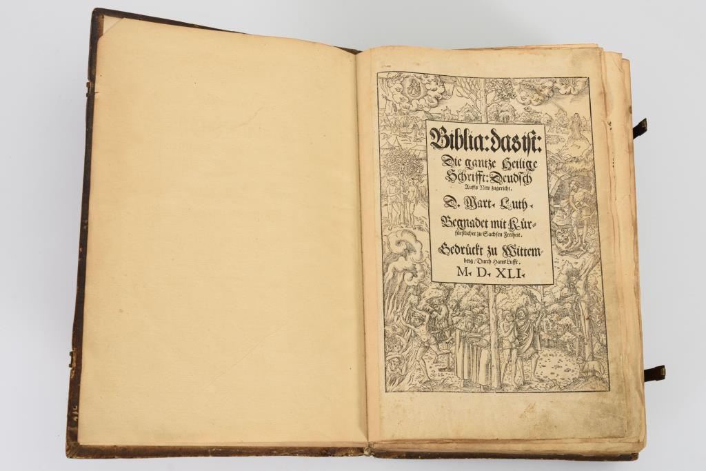 Band 1: Titelblatt mit Holzschnitt "Verdammnis und Erlösung". Widmungsblatt für Johann Friedrich Herzog zu Sachsen und Kurfürst. (6), CCCL (350), (1, Ende des Hohelieds Salomo) Blatt mit 63 Holzschnitten. Geprägter Ledereinband, Rücken gerissen, Vorsatz jünger. Die ersten vier Blätter lose. Schmaler Wasserfleck am Rand. Funktionierende Schließen und fehlende Metallecken. / Band 2: Titelblatt mit dem Holzschnitt "Verdammnis und Erlösung", auf Rückseite großes Wappenbild des sächsischen Wappens. 411 Blätter inclusive des Neuen Testaments. "M. Georg Rörer der Bibel Corrector." Insgesamt 63 Holzschnitte. Geprägter Ledereinband mit rissigem Rückenleder, fehlende Ecken, Schließen vorhanden aber defekt. Vereinzelt Anobienspuren im Deckel. Letztes Blatt mit einem handschriftlichen Gebet für einen 1543 verstorbenen Vikar. In beiden Bänden zahlreiche Unterstreichungen mit rötlicher Tinte. In Art der Bindung und Vermerke zusammengehörig.