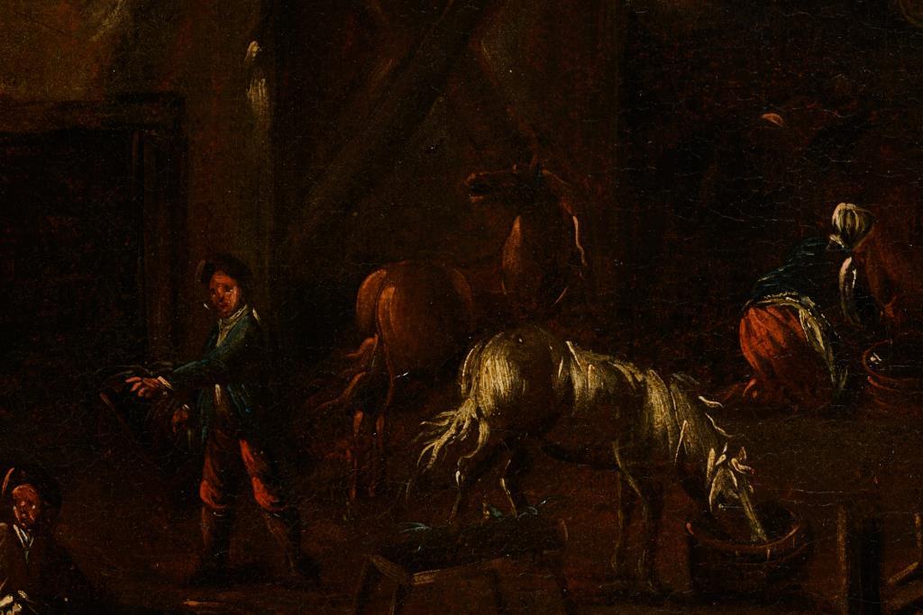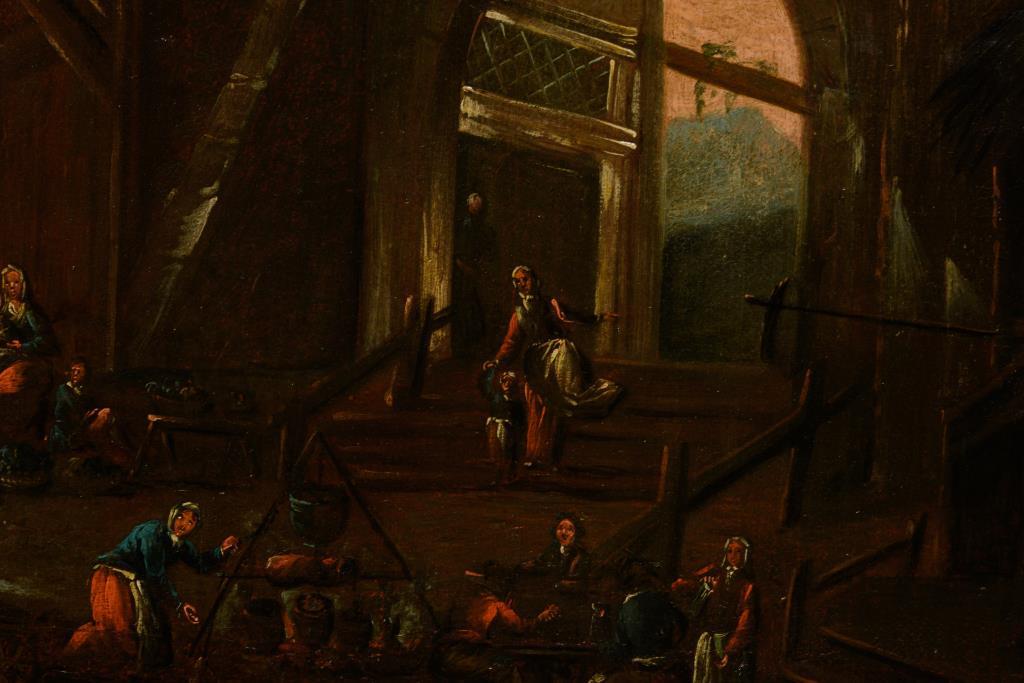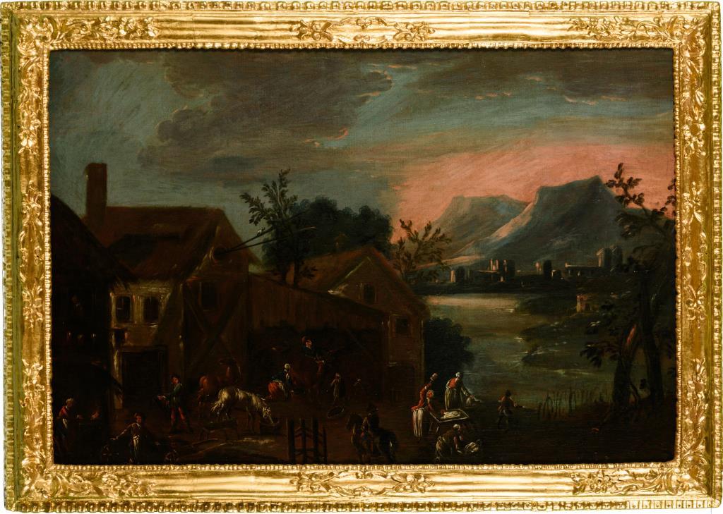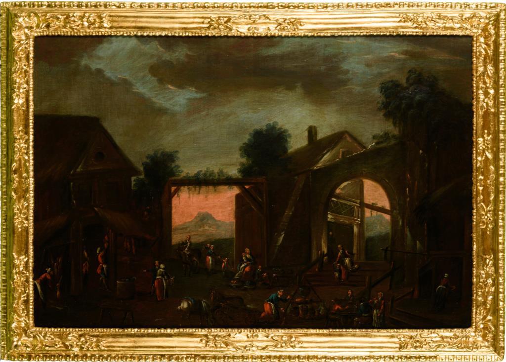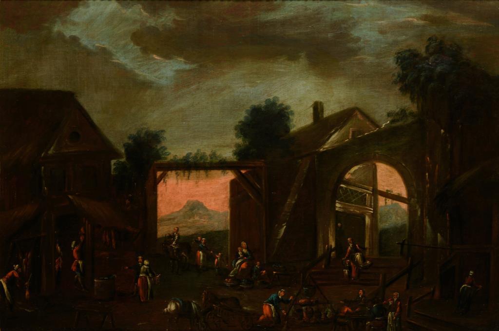 Je Darstellung von Bauernvolk in alltäglichen Szenen des Dorflebens. Je Leinwand doubliert.