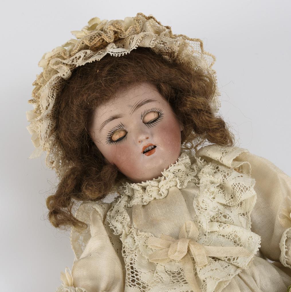 Crank head, blue sleeping eyes, light brown mohair wig, 5-piece mass body with modeled shoes, white little dress, hat with straw and lace. In addition, 2 dogs with real fur. Head x-rayed: without defects. 1 foot defective.