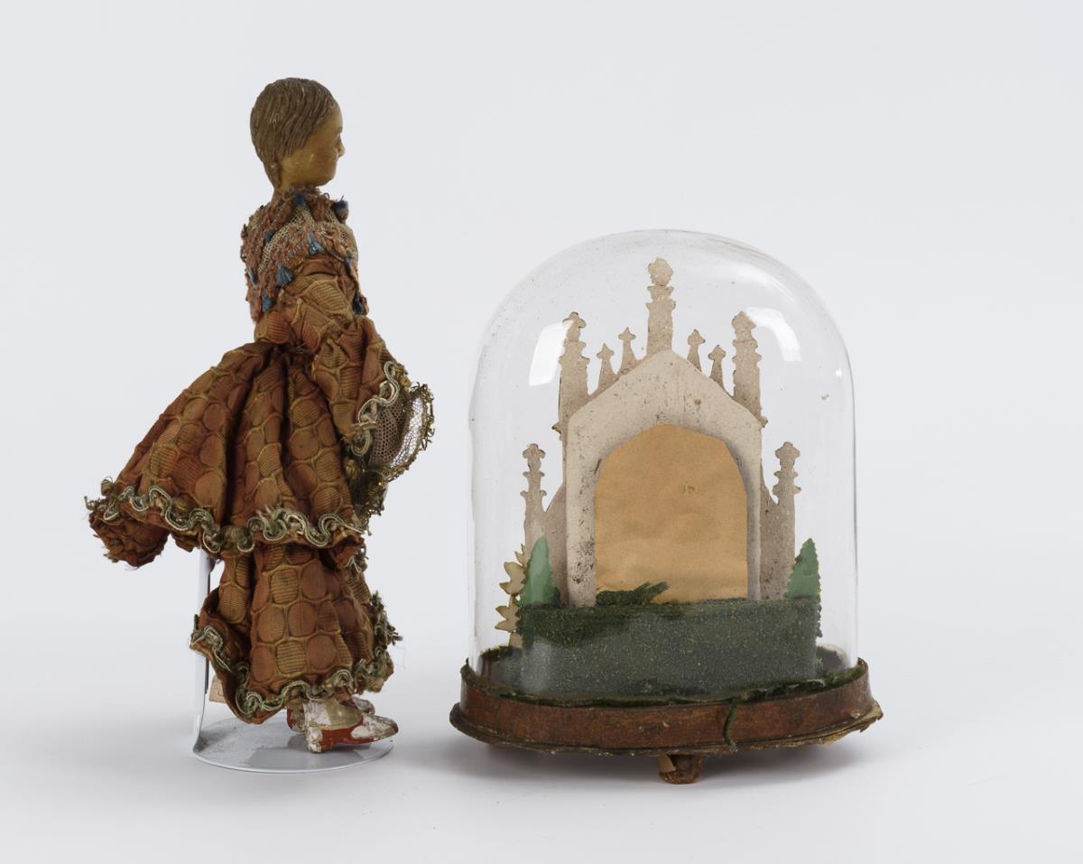 Miniature church with figures under glass lintel, plus doll with wax head.