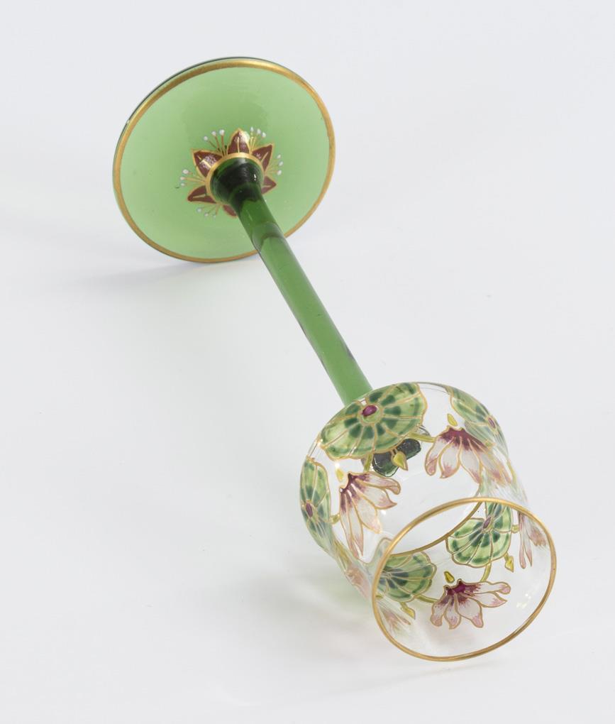Longitudinal optically blown dome of colorless glass, stem and round base of green glass. Circumferentially a polychrome painted, five-fold repeating alpine violet decoration in tranparent and opaque enamel with contour drawings in gold.