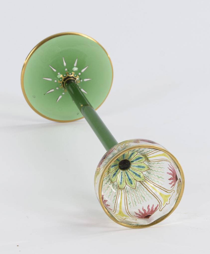 Bell-shaped, longitudinally optically blown dome of colorless glass, stem and round base of green glass. Circumferentially a polychrome painted, stylized and five-fold repeating floral decoration in transparent enamel with gold contour drawings and gold rim.