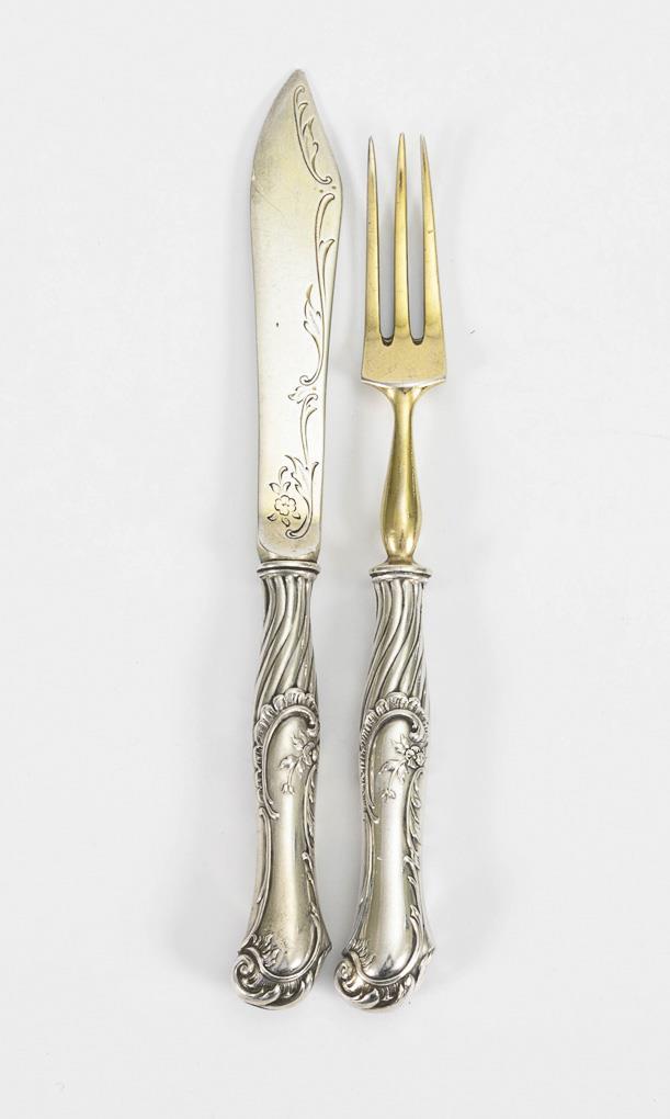 Dainty 12-piece dessert set with rocaille handles, prongs and blades gilded. Gilding somewhat rubbed.