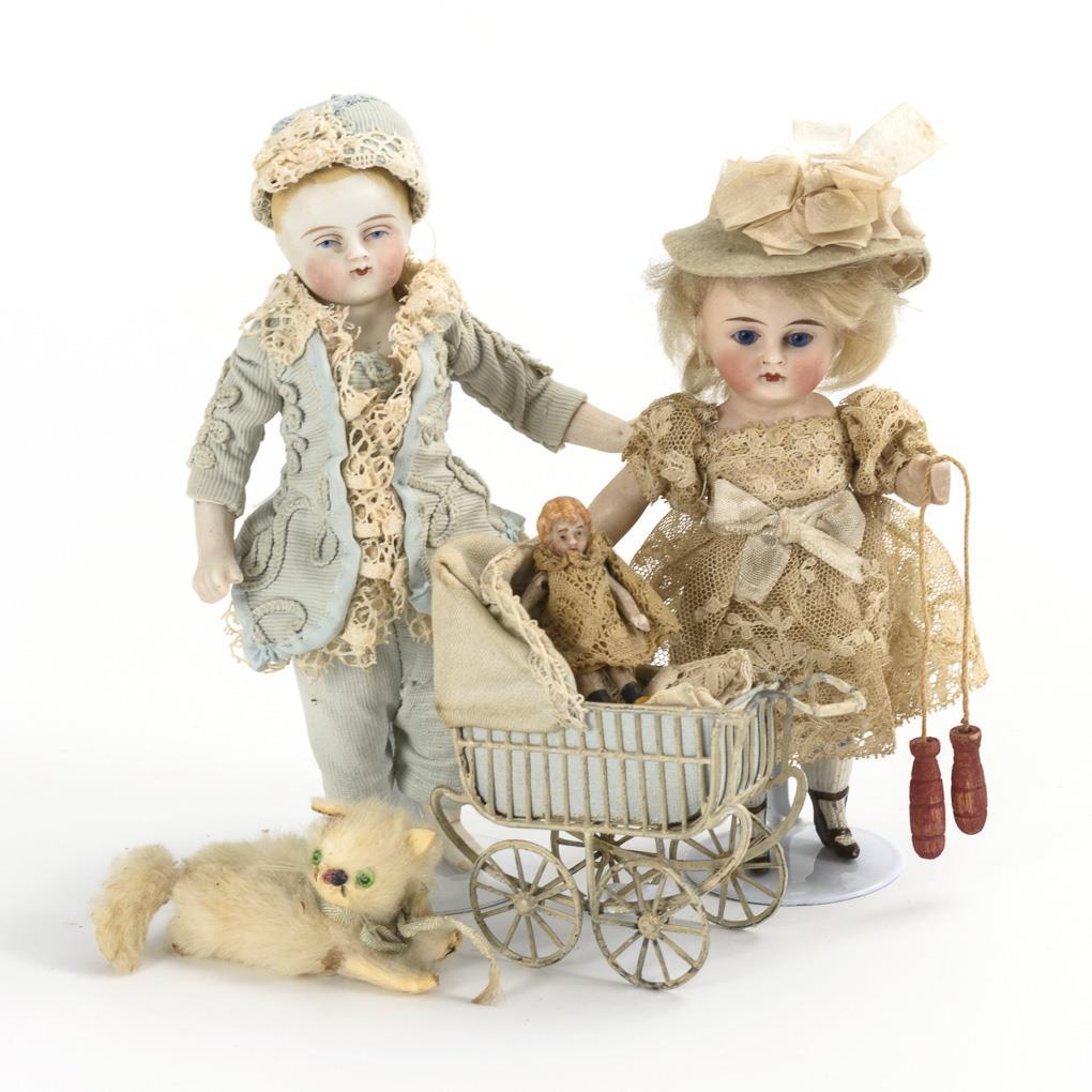 Barefoot boy with painted blue eyes and blond hair. Girl with blue glass eyes and blond mohair wig, modeled shoes and stockings. In addition, pewter carriage with miniature doll and small white cat with real fur. 1x with burn crack on the head, 1 foot glued.