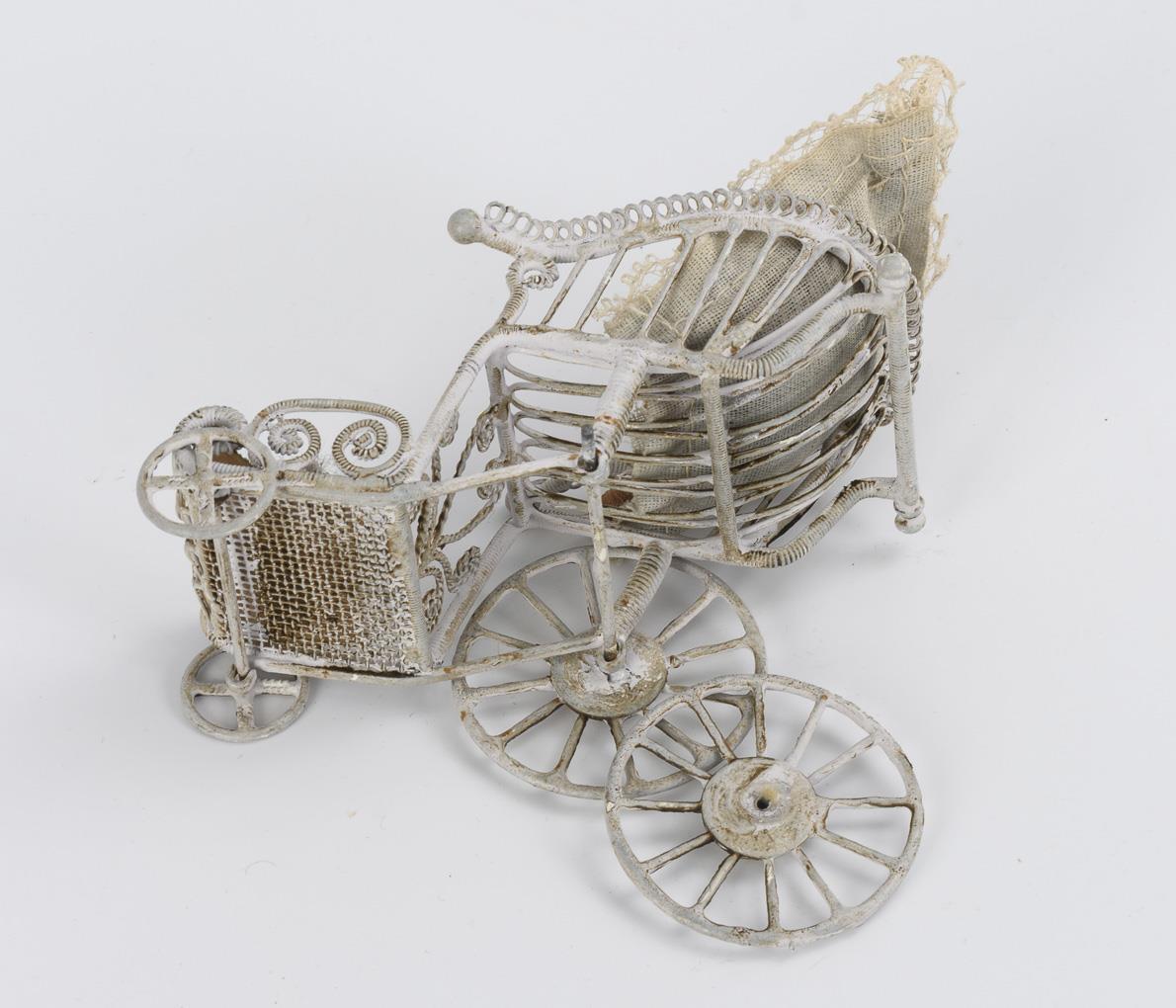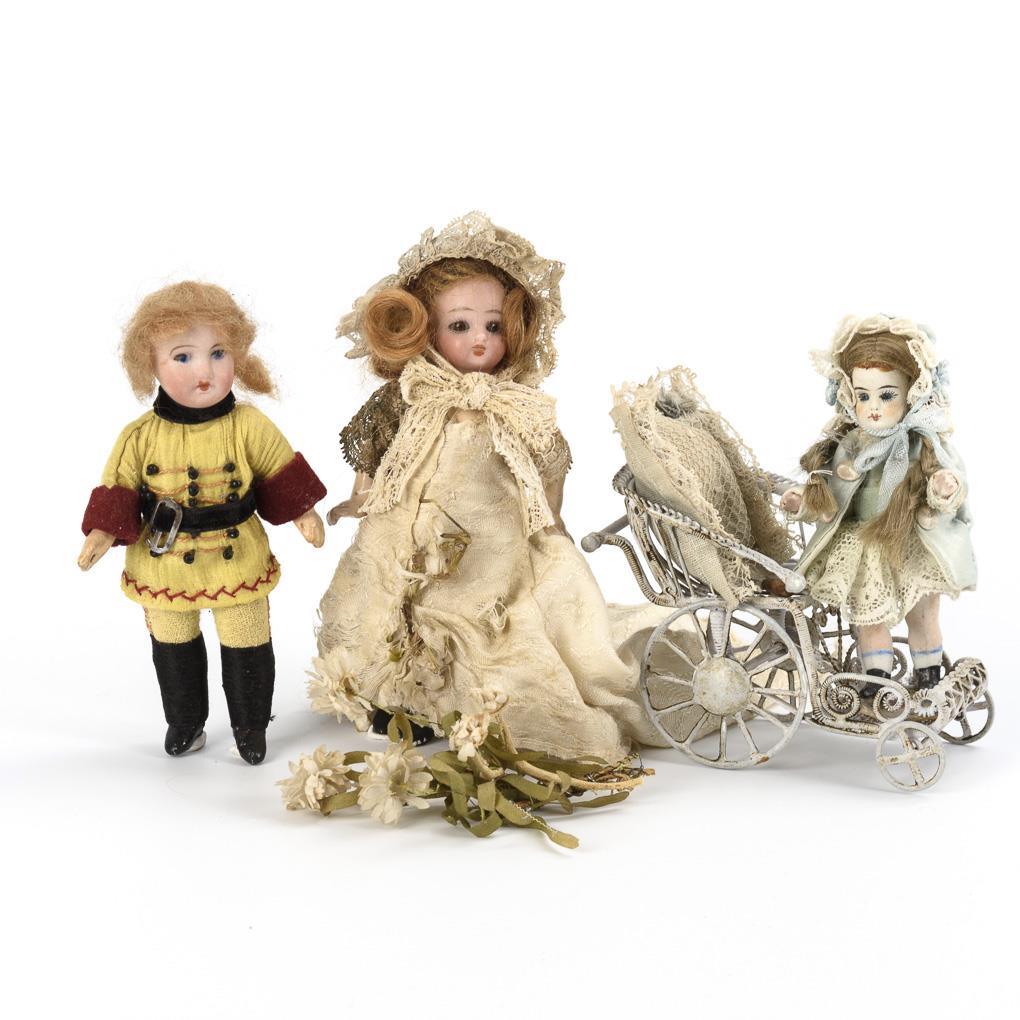 All with crank head, glass eyes, mohair wig, standing doll body and little dress. 3x whole bisque, 3x with mass body. As an addition wire wagons in old style. Parts with age traces, including 2 dolls probably younger, carriage new.