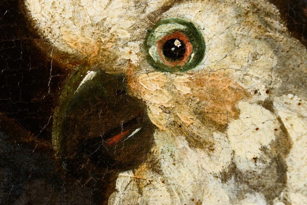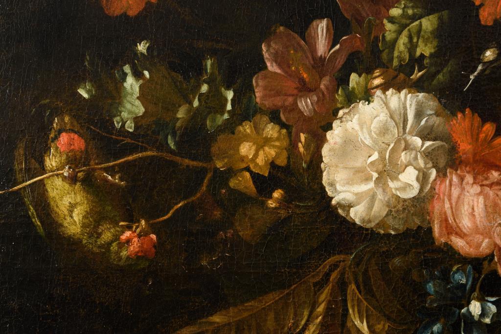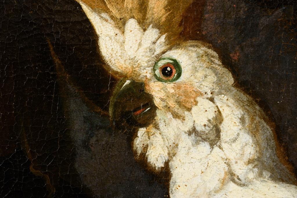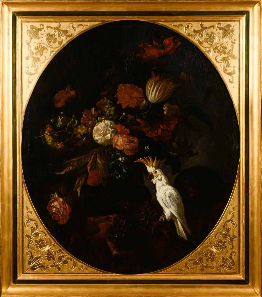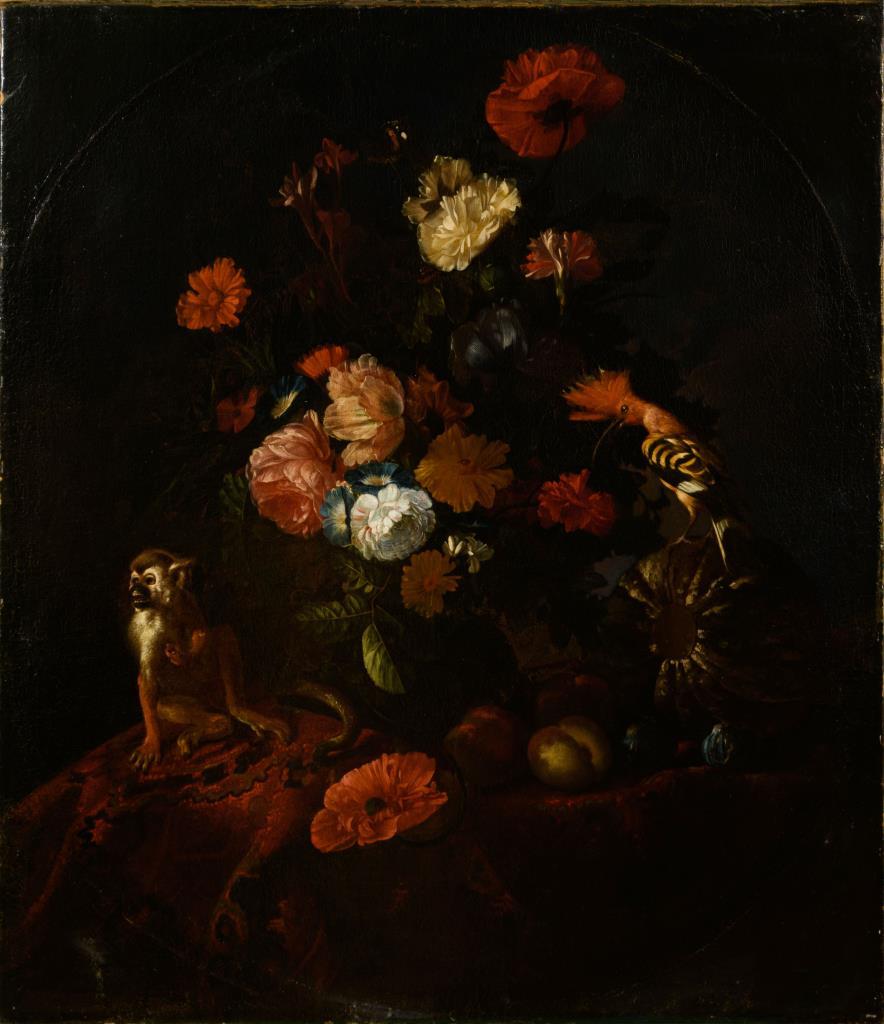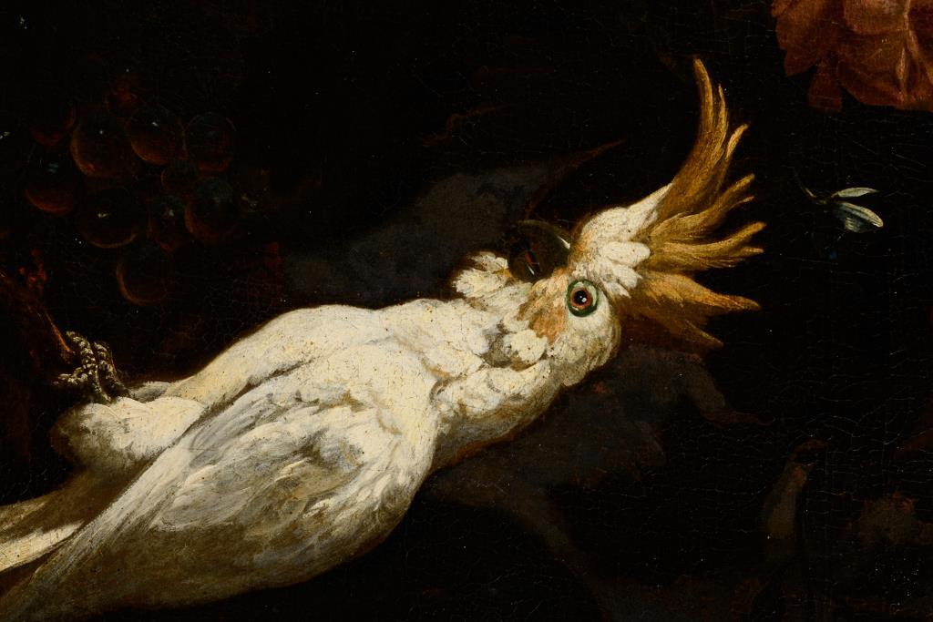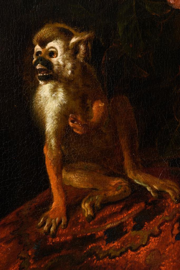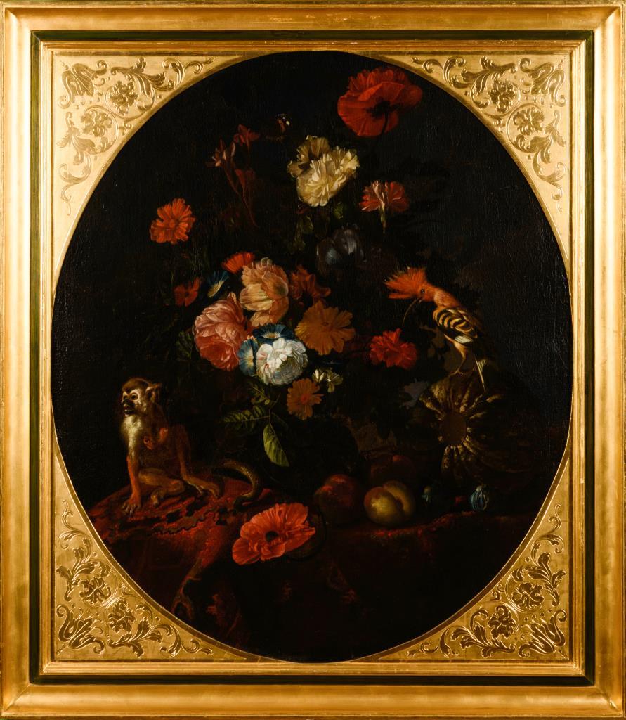 Zwei großformatige Stillleben-Pendants mit herrlich blühenden Blumen in Vasen neben Obst, Vögeln und einem Affen. Je Leinwand doubliert.