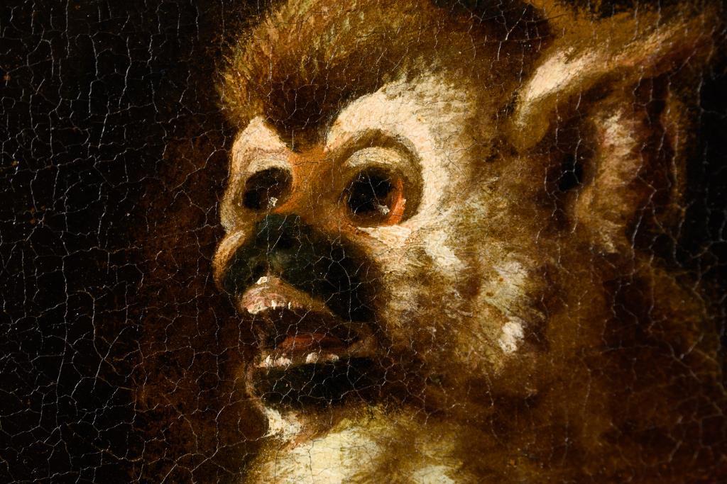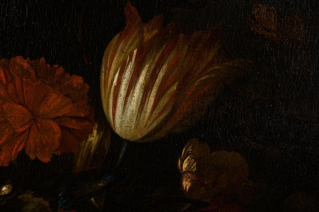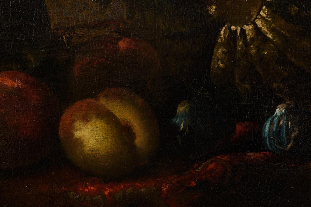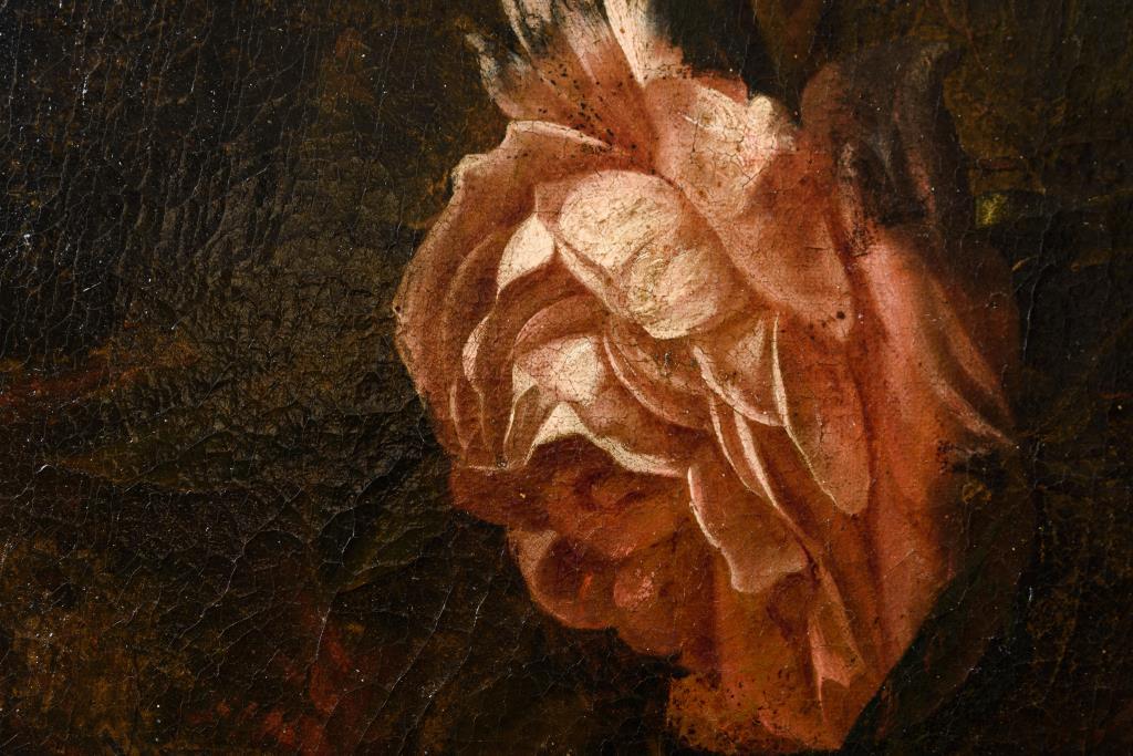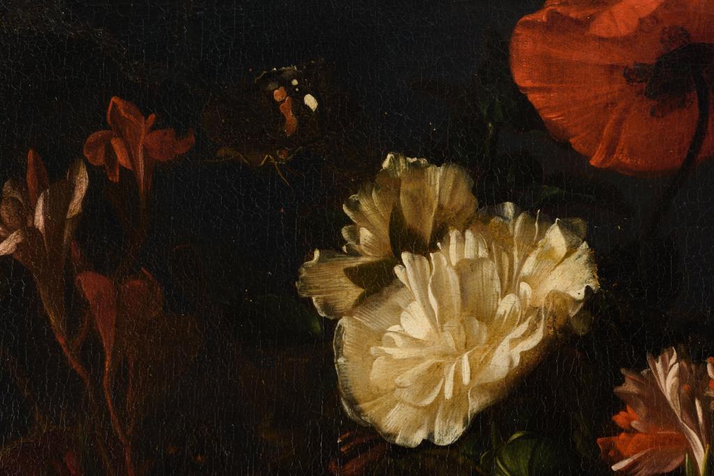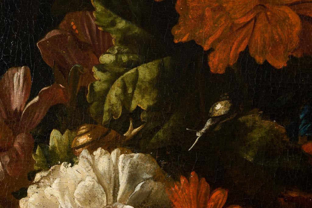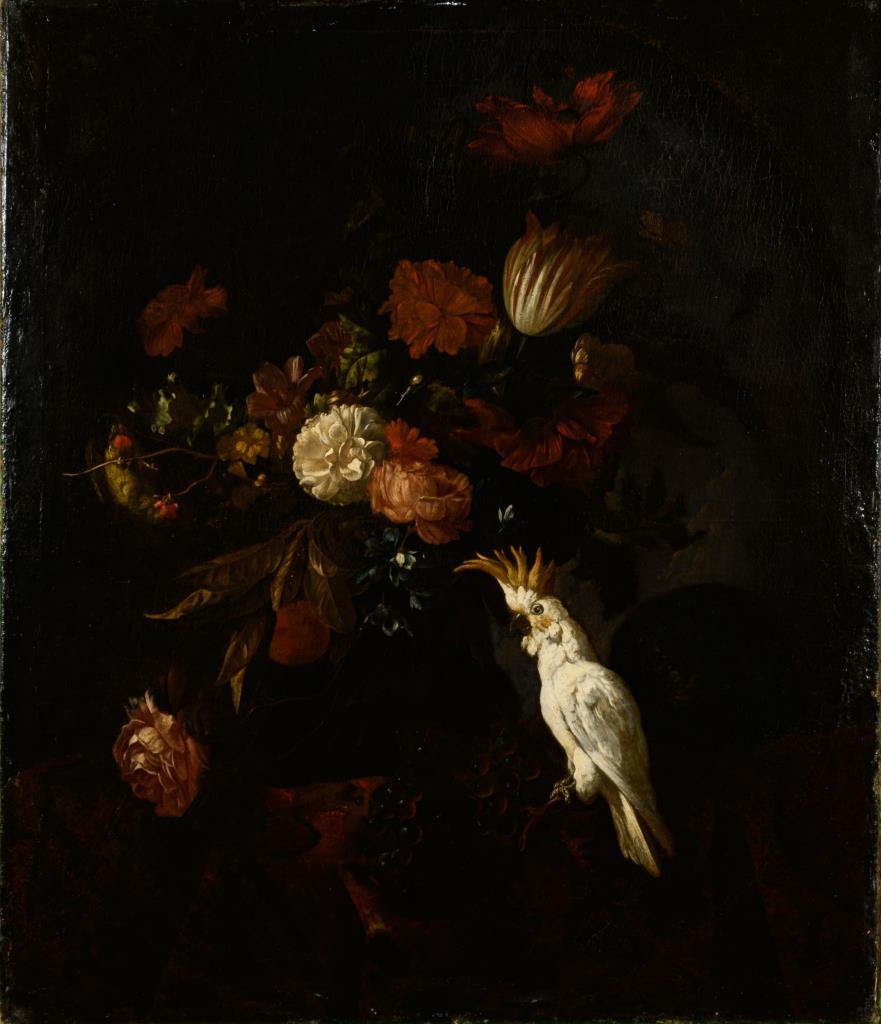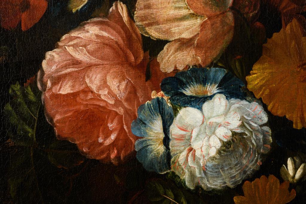 Zwei großformatige Stillleben-Pendants mit herrlich blühenden Blumen in Vasen neben Obst, Vögeln und einem Affen. Je Leinwand doubliert.