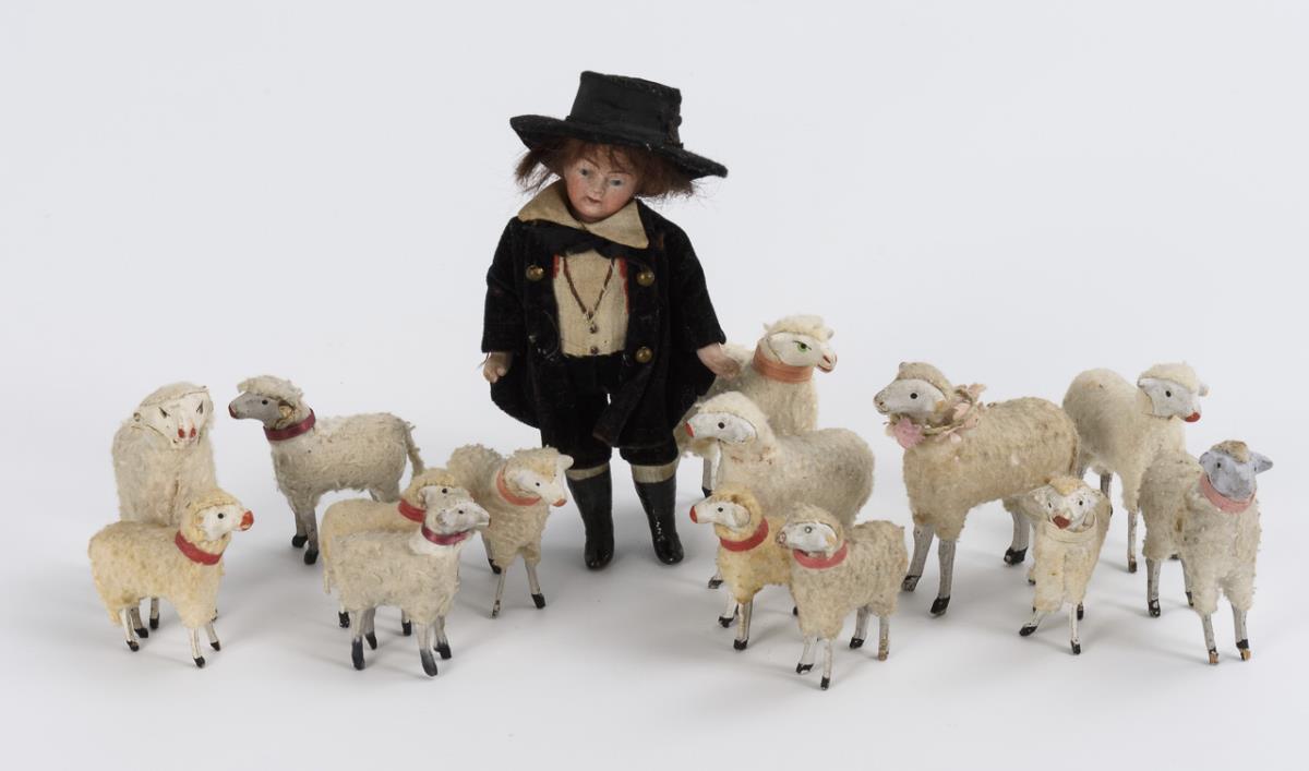 Whole bisque doll with crank head, painted blue eyes, brown mohair wig and sculpted black boots. Black velvet suit, matching hat. In addition, white sheep with wooden legs. Partly slight signs of age.