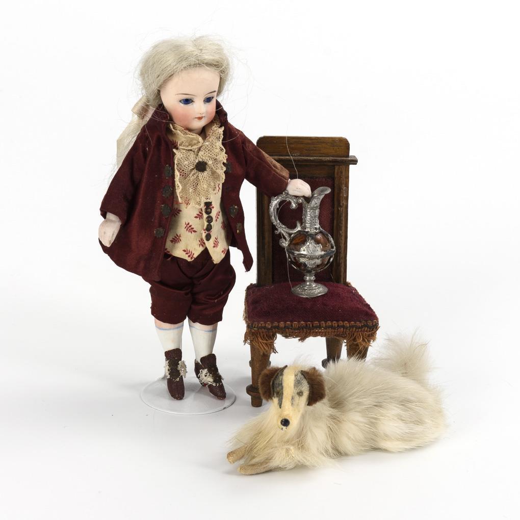 Dollhouse doll as a boy in courtly clothes and girl with white winter clothes, h each ca 17 cm. In addition, lying dog with real fur, burgundy upholstered chair and small pewter jug with glass insert. Small defects.