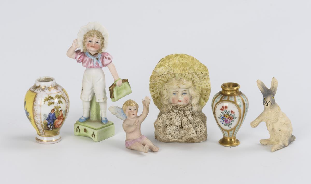 3-sided glazed display case in baroque style, with colored lithographed cardboard fronts. In it 6 pieces of porcelain knickknacks (including 2 hand-painted miniature vases, 1x Dresden marked). Traces of age, small defects.