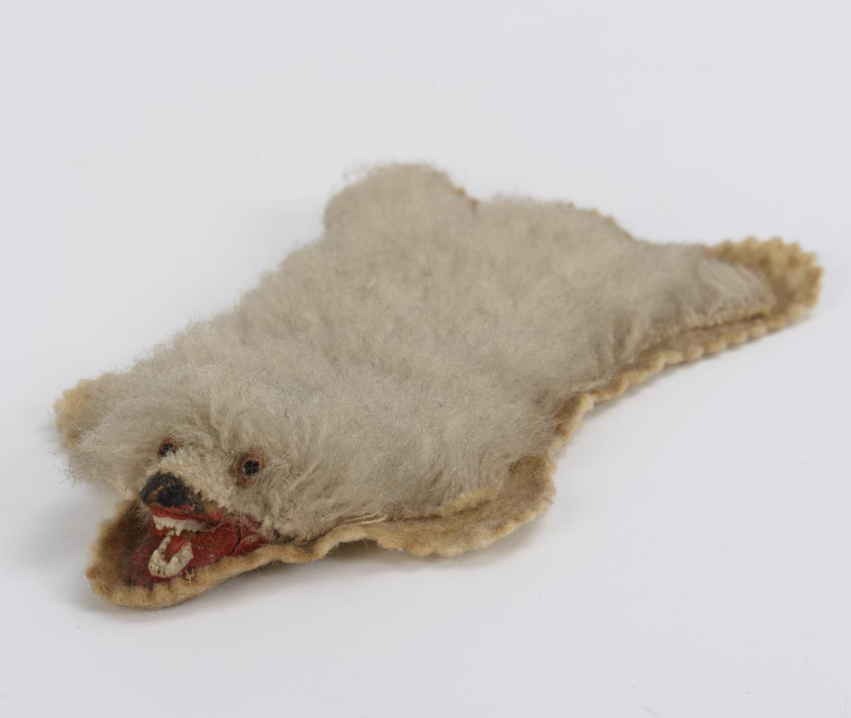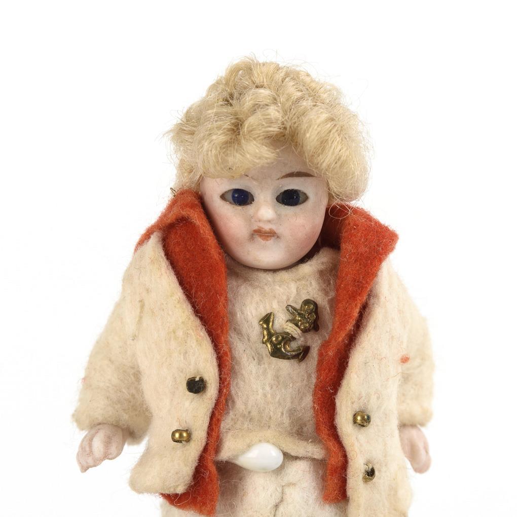 White faux fur with bear head, glass eyes and mouth ripped open. L 13,5 x 8 cm. Small whole bisque boy with solid head, blue glass eyes, blond wig and white felt suit. L 10 cm. Minimal signs of age.
