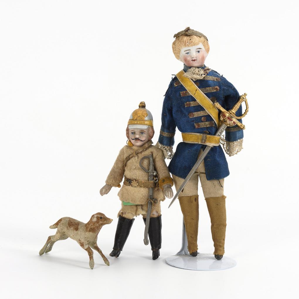 Blond chest head doll with blue uniform jacket and rapier. H 15 cm. Small whole bisque doll with modeled helmet and mustache. In original felt clothing. H 10 cm. In addition, small hunting dog with velvet fur. Traces of age, clothing with defects.