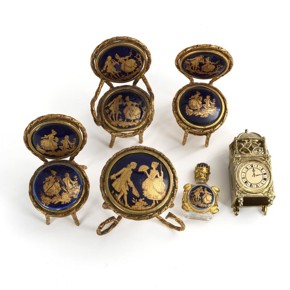 Table, 2 chairs and 1 armchair with inlaid blue porcelain plates and gold decor. In addition, matching flacon and dollhouse clock with paper dial. 1 seat glued.
