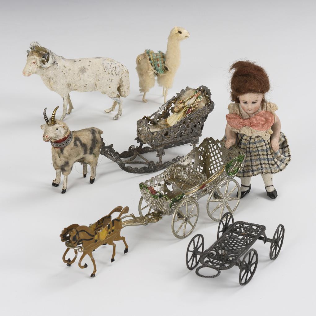 2 pewter wagons and 1 sleigh, 3 animals and 1 whole bisque doll. Small defects.