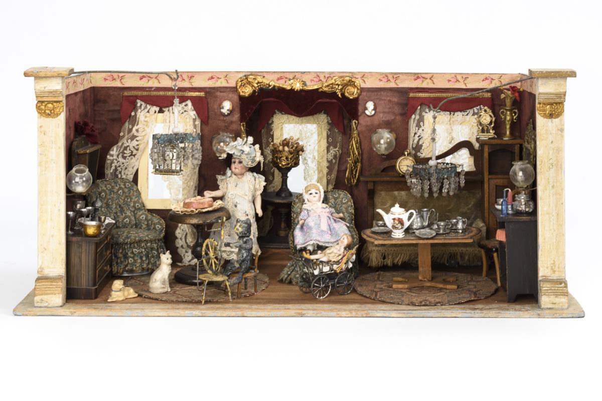 1-room dollhouse with 3 glazed windows, curtains and 2 ceiling lamps. Founder period furnishings with sofa, 2 armchairs, table, chest of drawers, half cupboard etc. In addition, 3 dollhouse dolls, some animals and various dishes. Traces of age, small defects.
