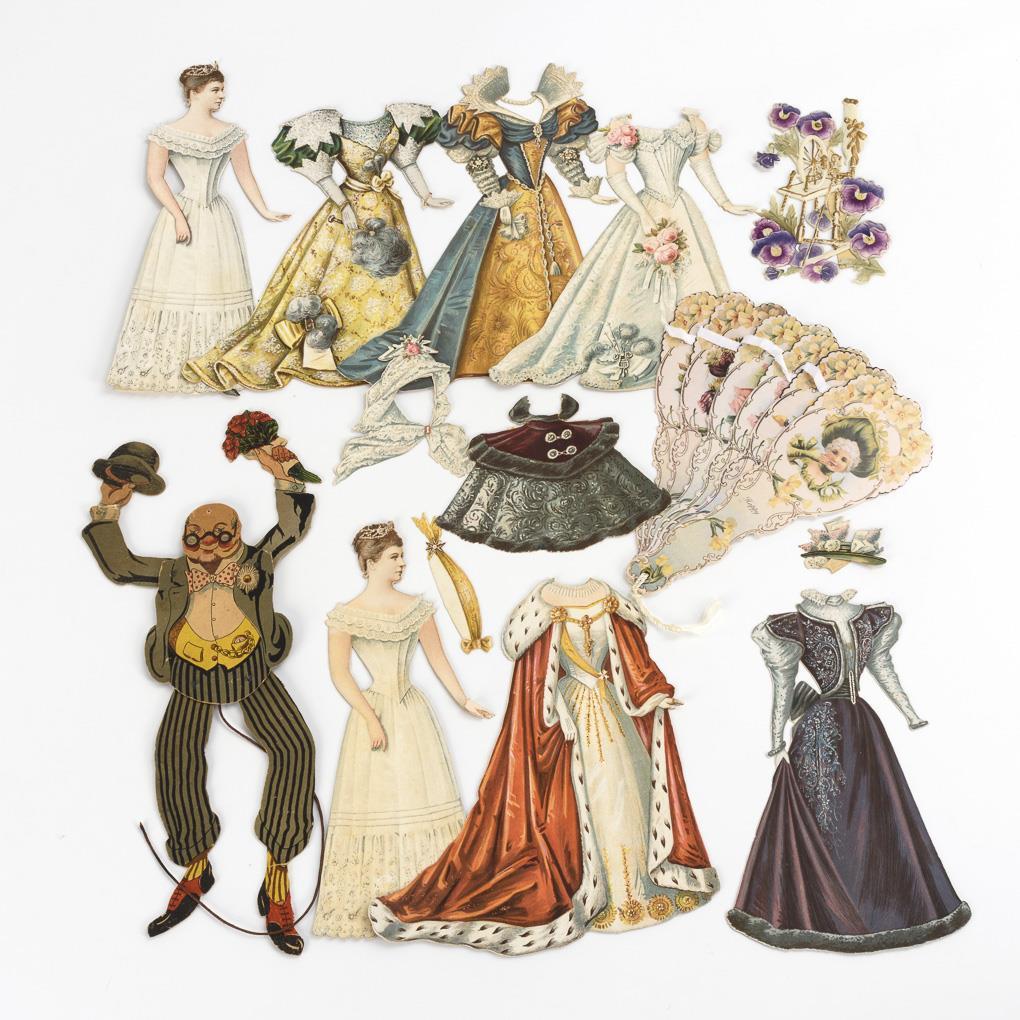 2 queen figures with 4 dresses, ermine coat, fur cape, hats and spinning wheel. / Jumping jack with bouquet of flowers. / Cardboard fan "Happy birthday to someone special" (Reprint USA). Small defects and glue spots.