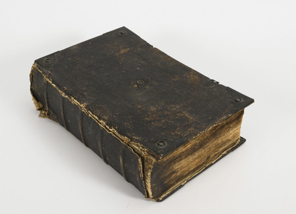 Endpapers with numerous family inscriptions. Title, (70), 1181, (21) pages with numerous illustrations, without the portraits of electors. Strong signs of age and wear, the first and last pages heavily stressed, last page only in fragment. Clasps missing, broken joint and traces of old anobia in leather wood cover.