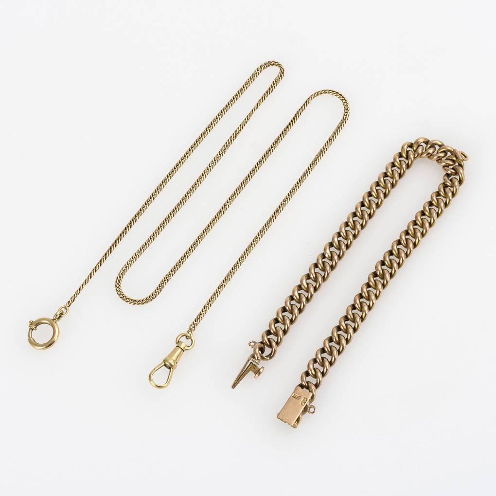 Watch chain with lobster clasp and spring ring, 585 hallmarked, L 44.5 cm, 7 g. Bracelet with pin closure and 3 eyelets, 333 hallmarked, L approx. 20.5 cm, 9 g.