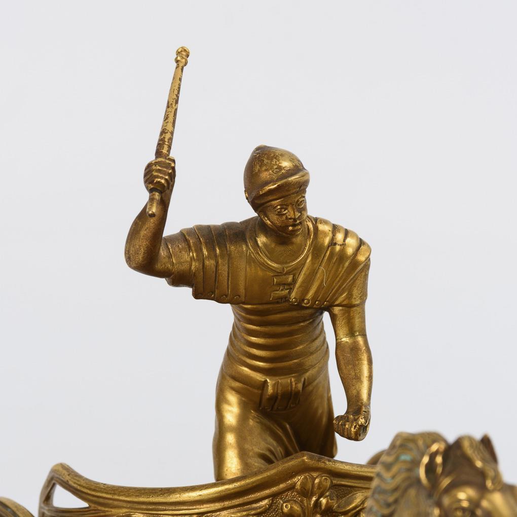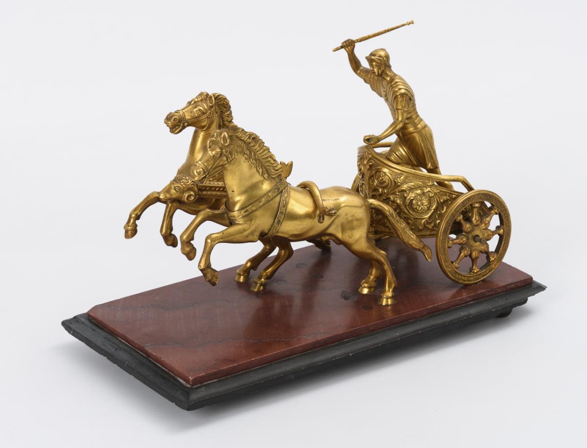 Finely executed casting of the magnificently relieved chariot (biga) with ram's head at the drawbar end. In the chariot standing leader who drives the two rising stallions. Slightly rubbed, reins and wheel nuts missing, chipping at the base.
