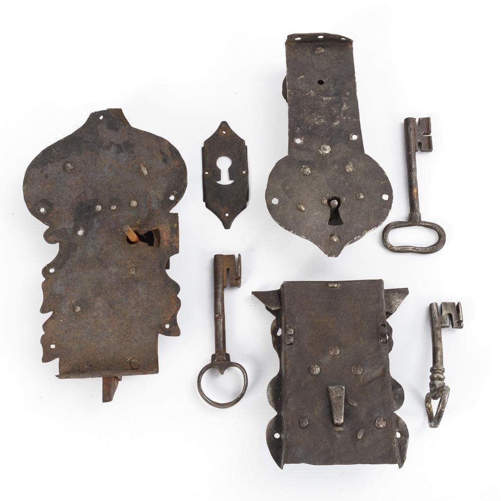Baroque lock with Einhaue on the lock top, intact Einingericht as well as probably original keyhole aperture. / 2 pincer locks; 1x as a box lock with complete Einingericht, 1x in the form of a cat's head with parts of the Einingericht. Partly minor flaws, partly restored, each age / use traces.
