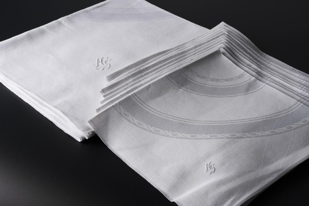 Tablecloth with a circumferential oval of different width jacquard stripes and a classicist trim, as well as centrally repeating oval. Comes with 12 napkins of the same type. Each with embroidered monogram "HS". Unused, 1x washed.