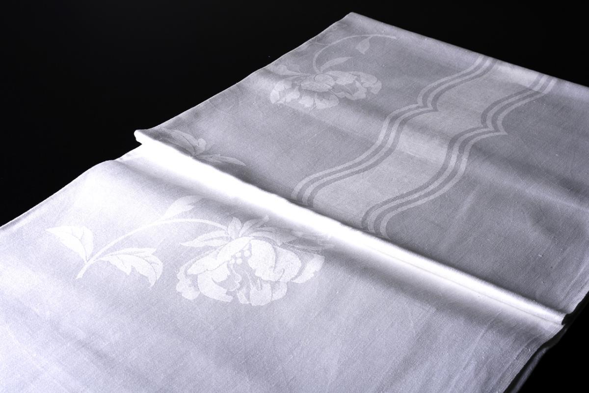 Wide outer oval of wavy jacquard stripes and a smaller inner oval and some interspersed peony branches. Unused, 1x washed.