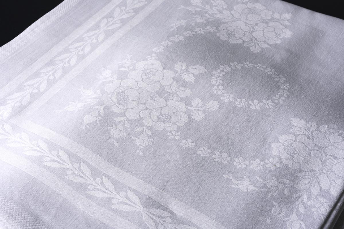 Westphalian cloth composed of 2 panels centered pattern: circulating border of small geometric figures; in the central area densely set small bar crosses. 166 x 160 cm. / Strong cloth with geometric pattern; centrally matched. Small red monogram. 162 x 156 cm.