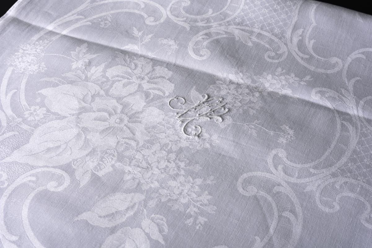 Circumferential wide border of flowers, alternating with matching rococo cartouches. In the mirror repeat of delicate floral arrangements embedded in rocaille. Embroidered decorative monogram AV/VA.