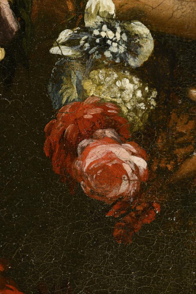 Young woman tying a garland of flowers around a sculpture in the park with a servant. Traces of age.