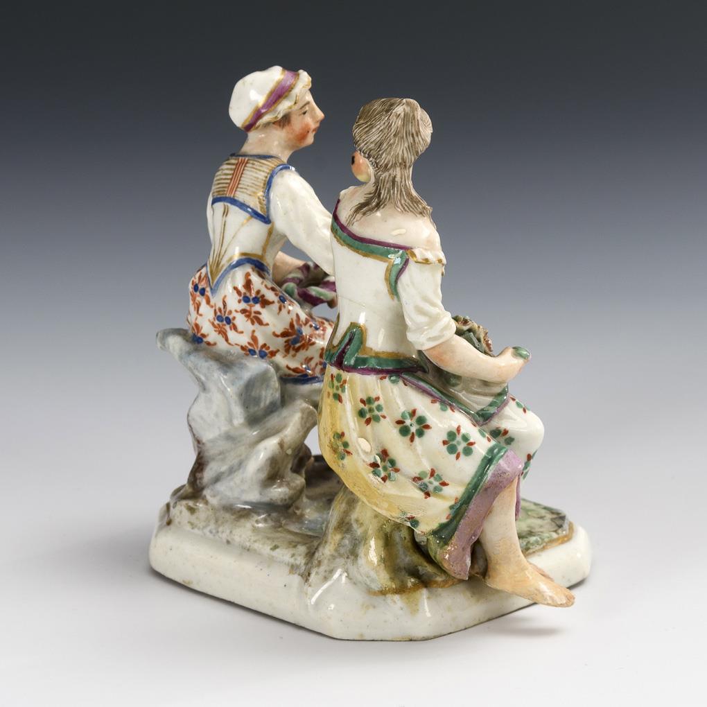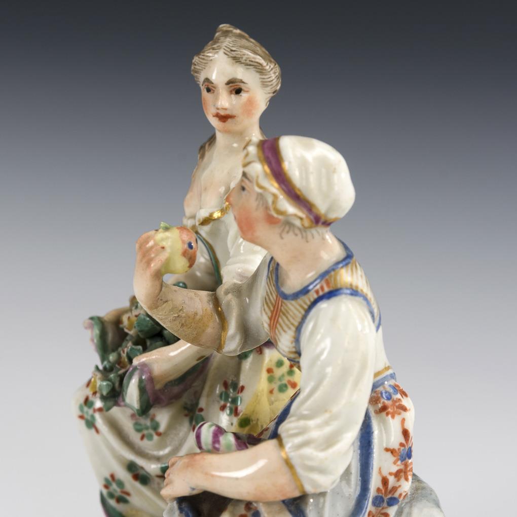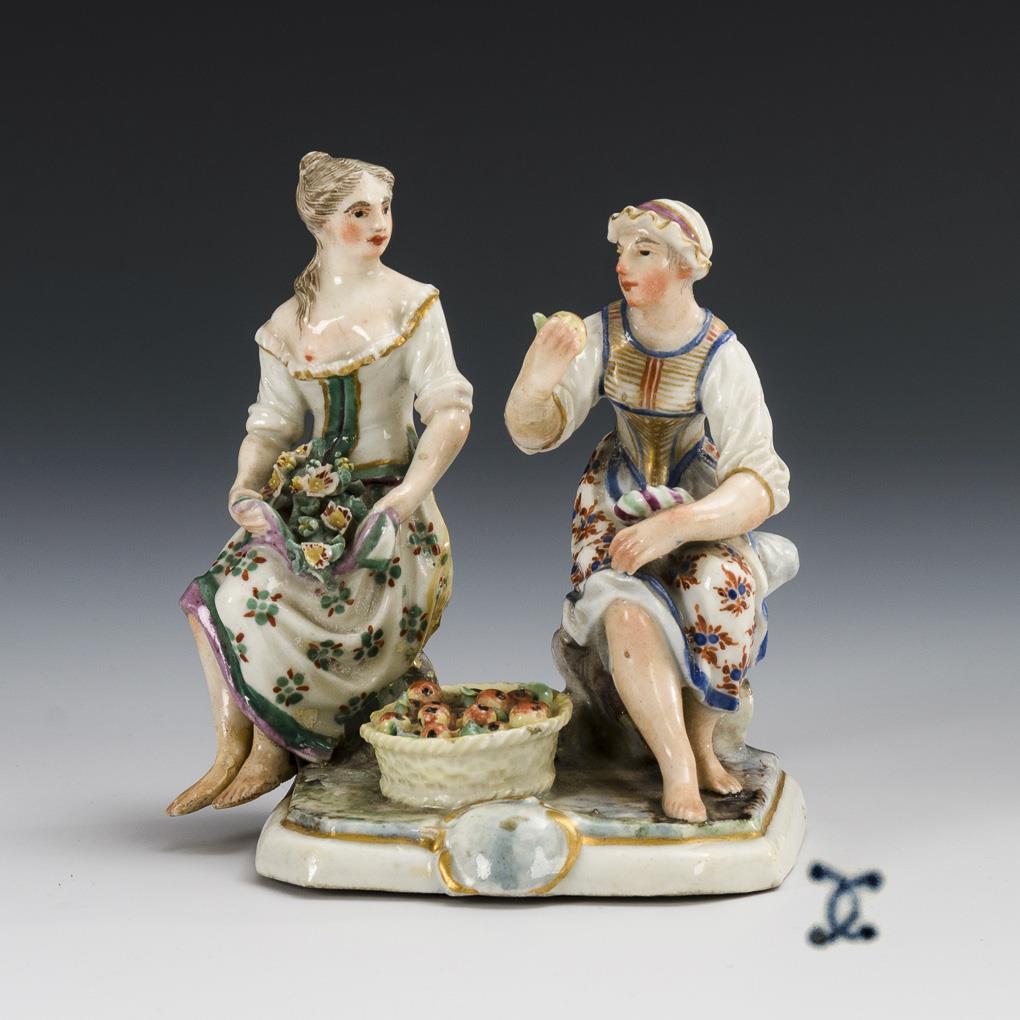 Two seated women with fruit basket. 1 woman with hairline crack at waist and 1 foot and restored on verso, 1 arm restored, bumps on flowers and leaves and on the rim of the basket.