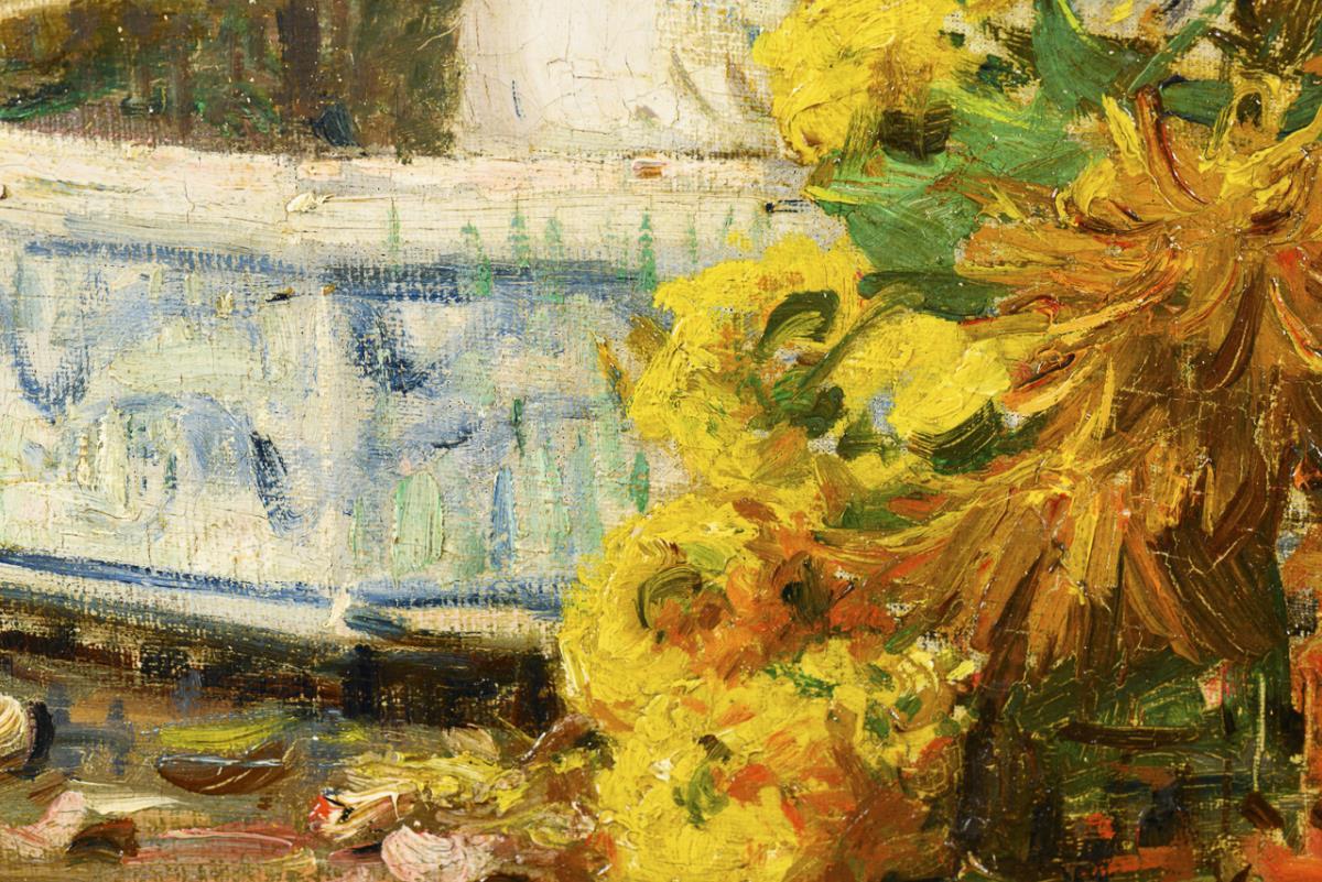 A bouquet of flowers in a pot with wash bowl next to another bouquet lying next to it in bright colors. Canvas doubled.