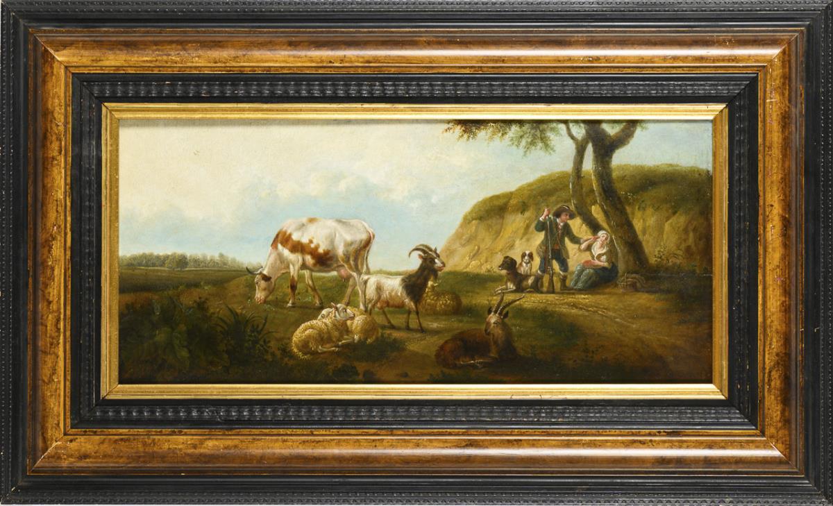 Meddlesome hunter with a shepherdess under a tree near the cattle in the meadow. Traces of age.