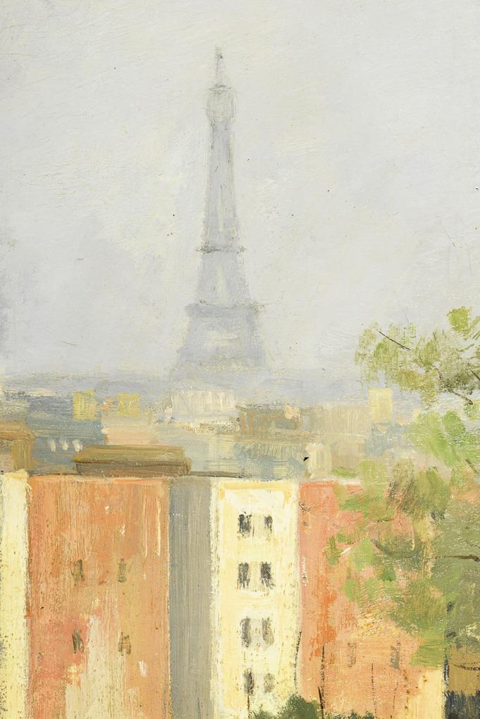Bright sunlight over the French capital with the Eiffel Tower in the atmospheric haze on the horizon.