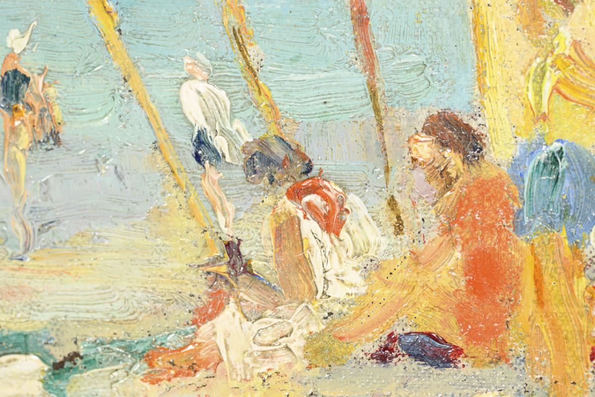 Many people in the sunshine on the beach with a view out to sea. Canvas edge-doubled.