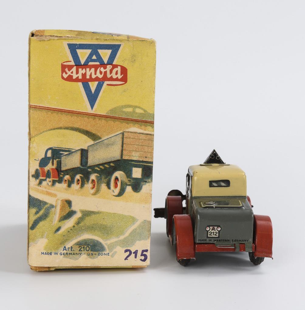 Mechanical tractor "A 212" with intact movement and key. In addition, original box for A 215. / 2 blue pendants with white diamond pattern. Scarcely played with.
